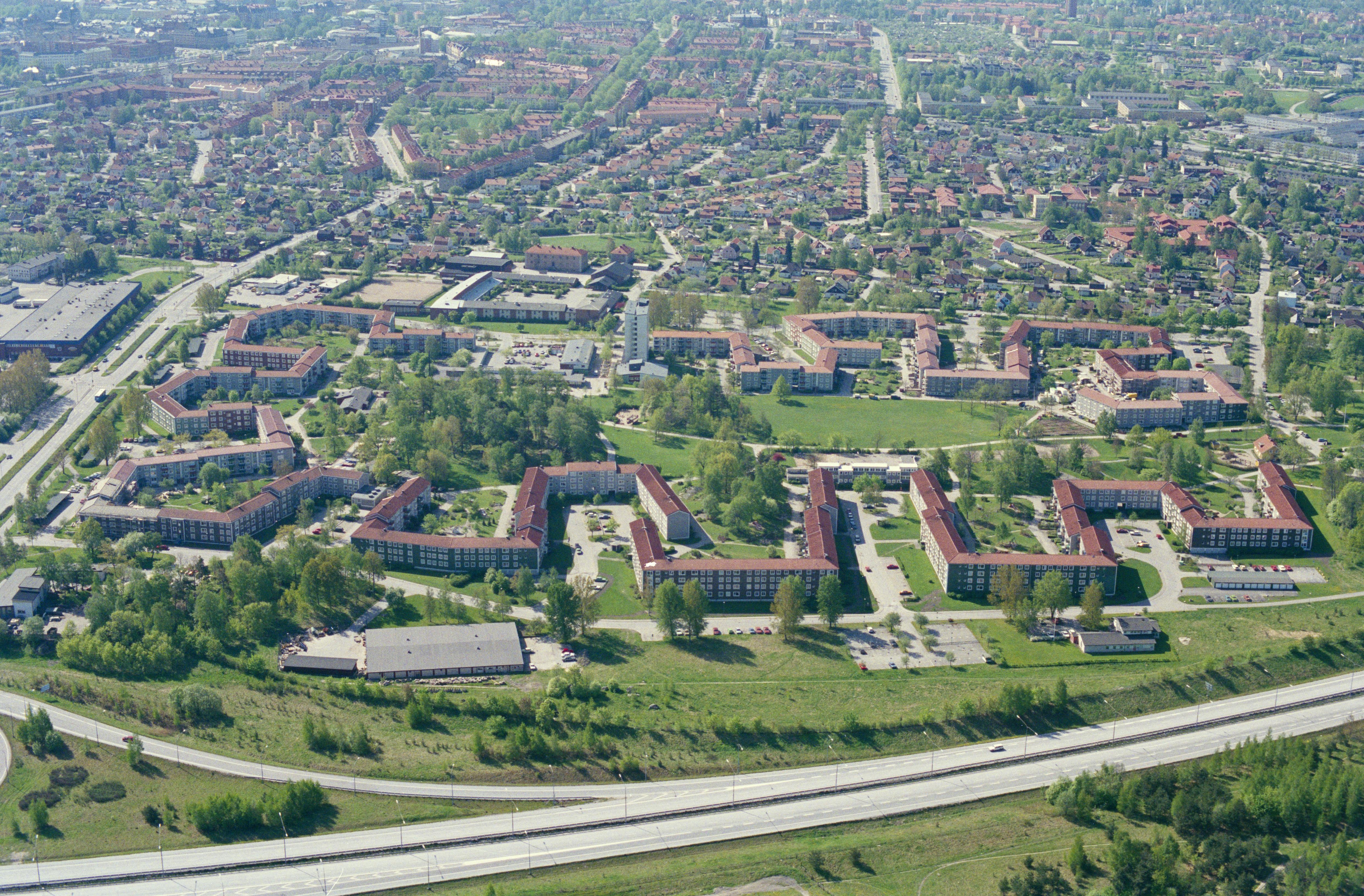 Beskrivning: Örebro stad. Vid bildens mitt bostadsområdet Baronbackarna med gravfält RAÄnr Örebro 48:1. Bilden är tagen mot (väderstreck): S