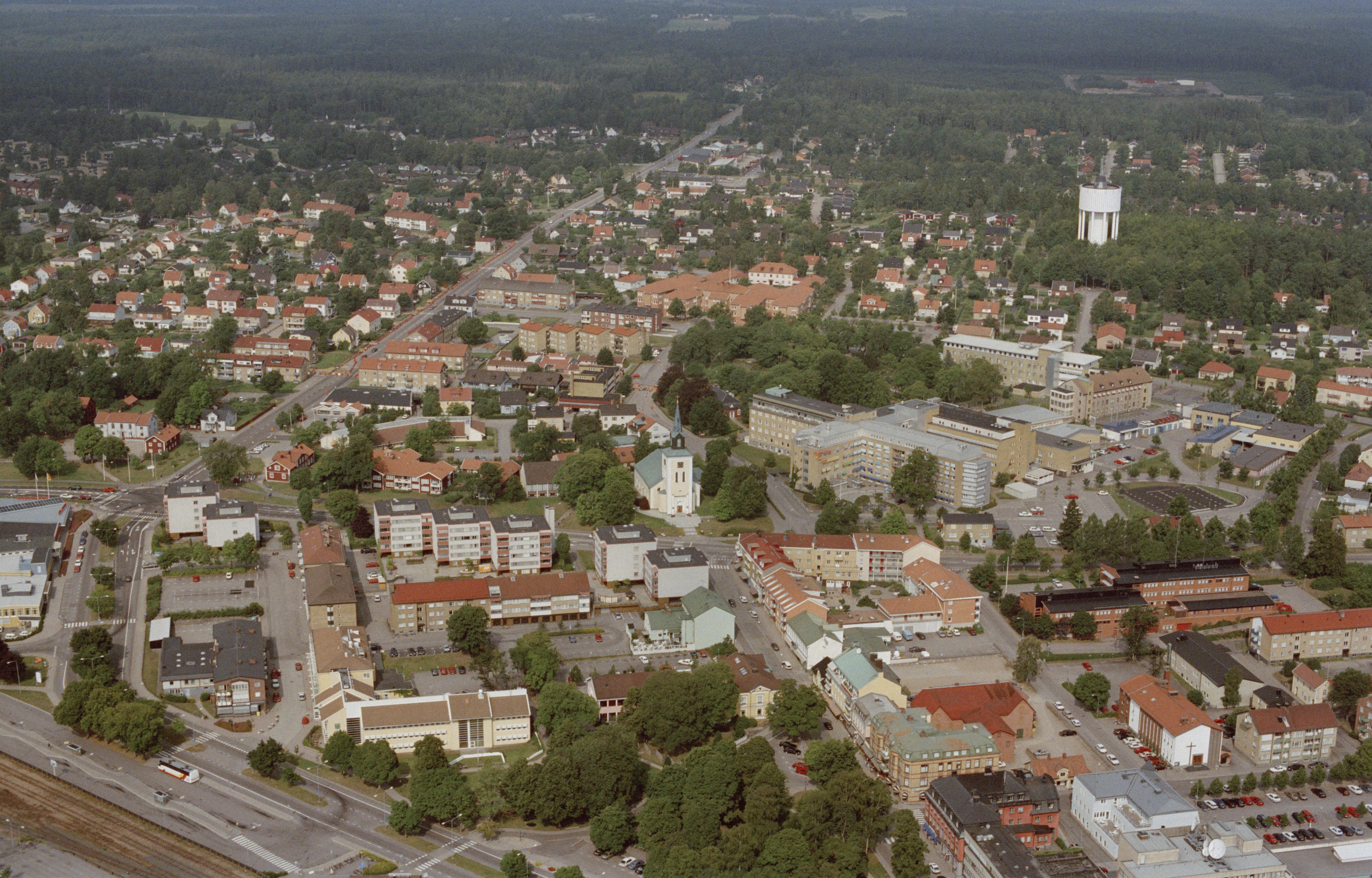 Beskrivning: Ljungby stad. Ljungby kyrka vid bildens mitt. Bilden är tagen mot (väderstreck): NV