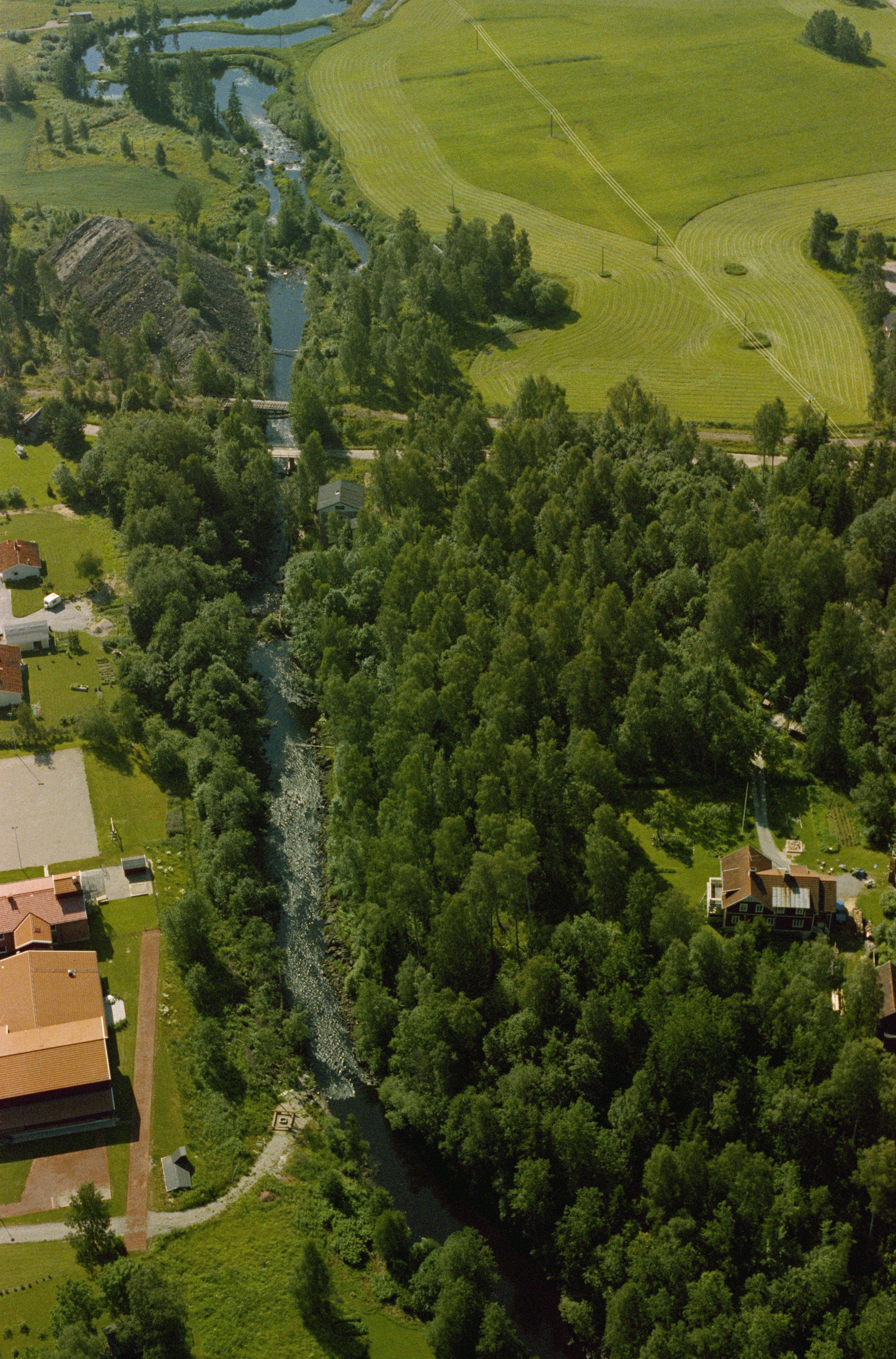 Beskrivning: Till höger i bildens nedre del området Trolltippen vid Rastälven i Järnboås by. Vid bron över bildens mitt hyttområdet Nedre Gammelhyttan RAÄnr Järnboås 142:1 och 183. Bilden är tagen mot (väderstreck): S