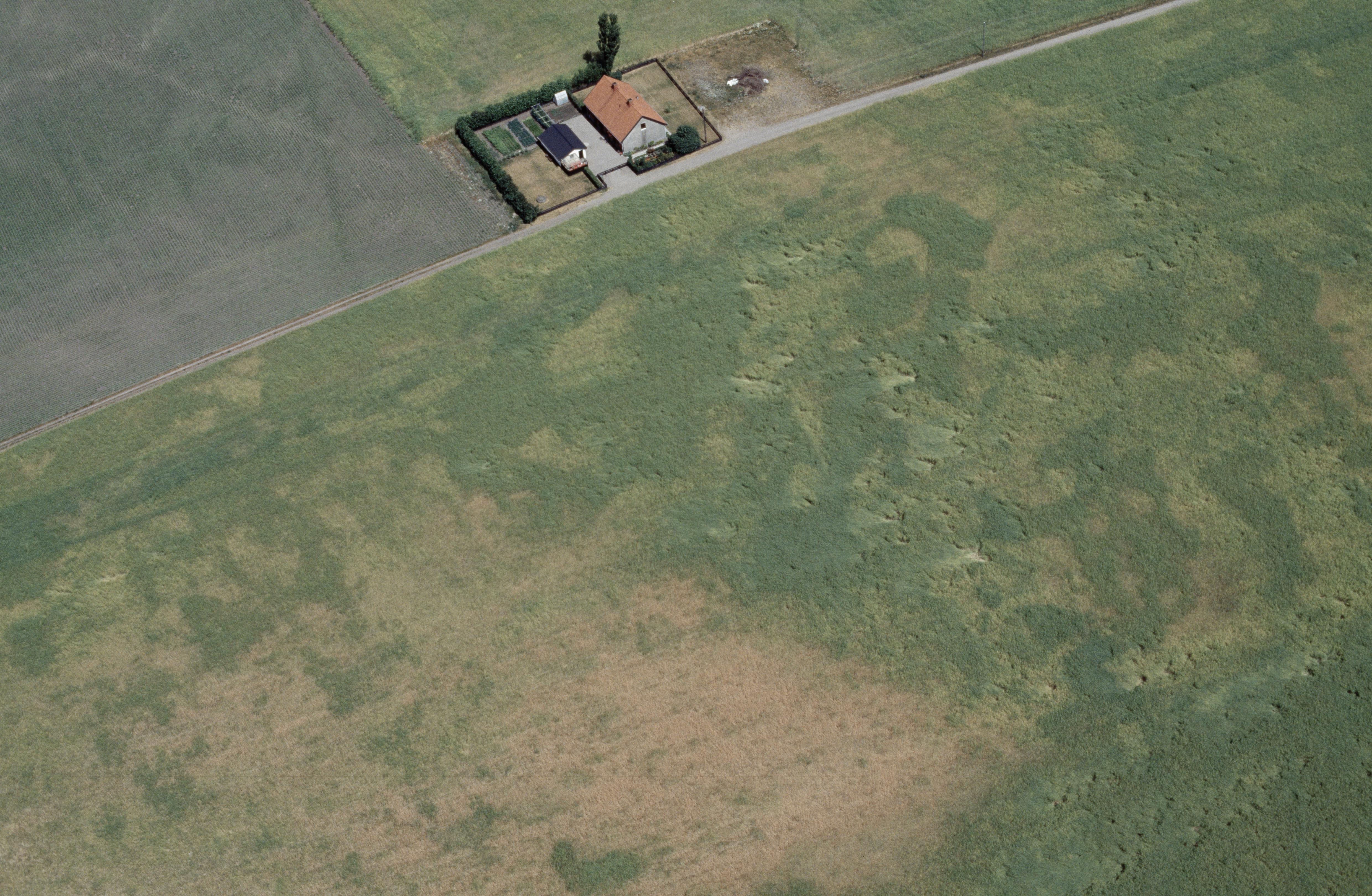 Beskrivning: Cropmarks i åker. Vid bildens mitt sammanförda fornlämningar RAÄnr Tygelsjö 52:1. I bildens nedre del boplats Tygelsjö 65. Bilden är tagen mot (väderstreck): N