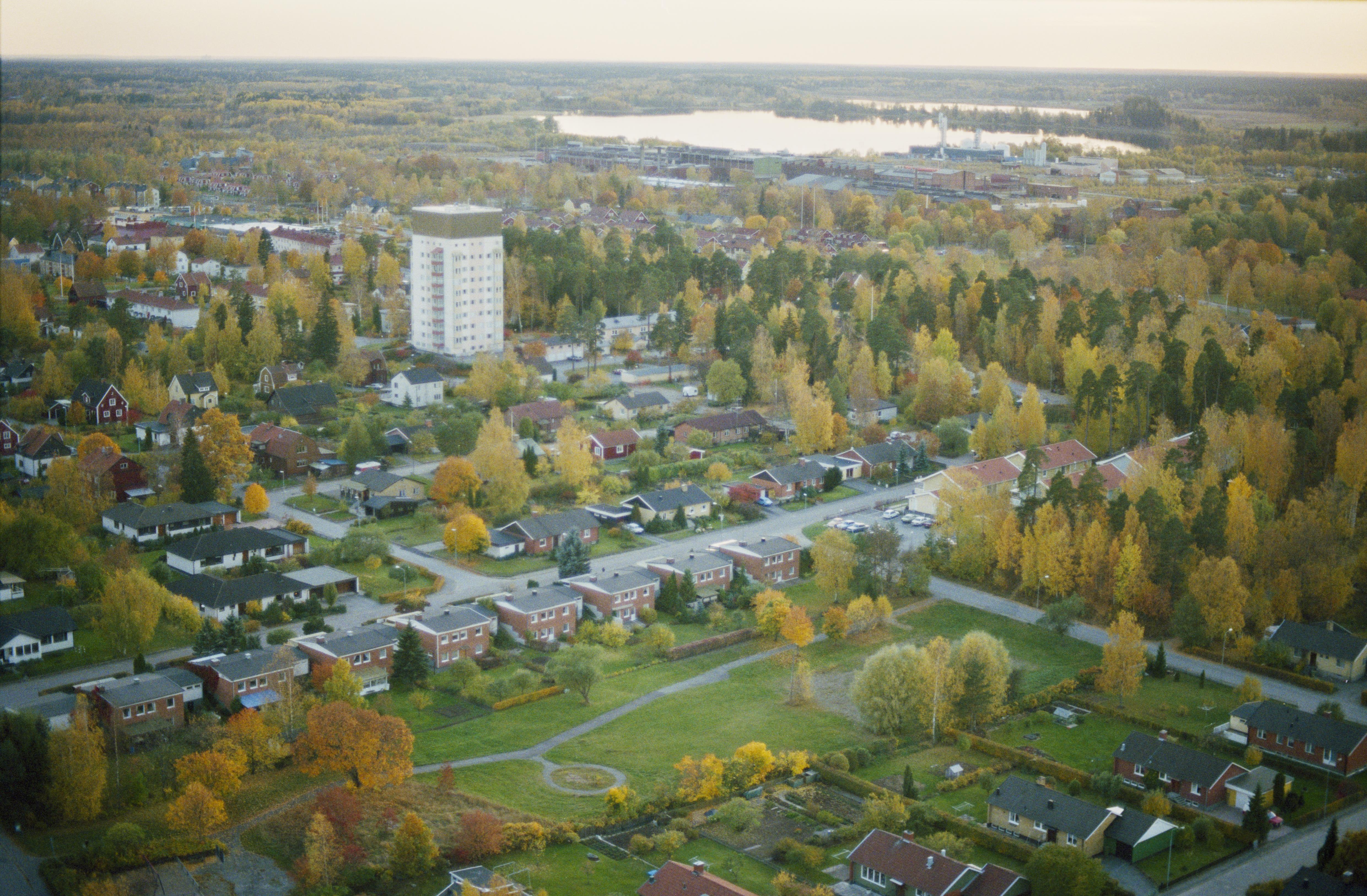 Beskrivning: Surahammars tätort och bruk RAÄnr Sura 49:1. Den höga byggnaden uppe till vänster står vid Skogsvägen och Bergsgatan. I bildens övre del Östersjön och byggnadsminnet Strömsholms kanal. Bilden är tagen mot (väderstreck): SSV