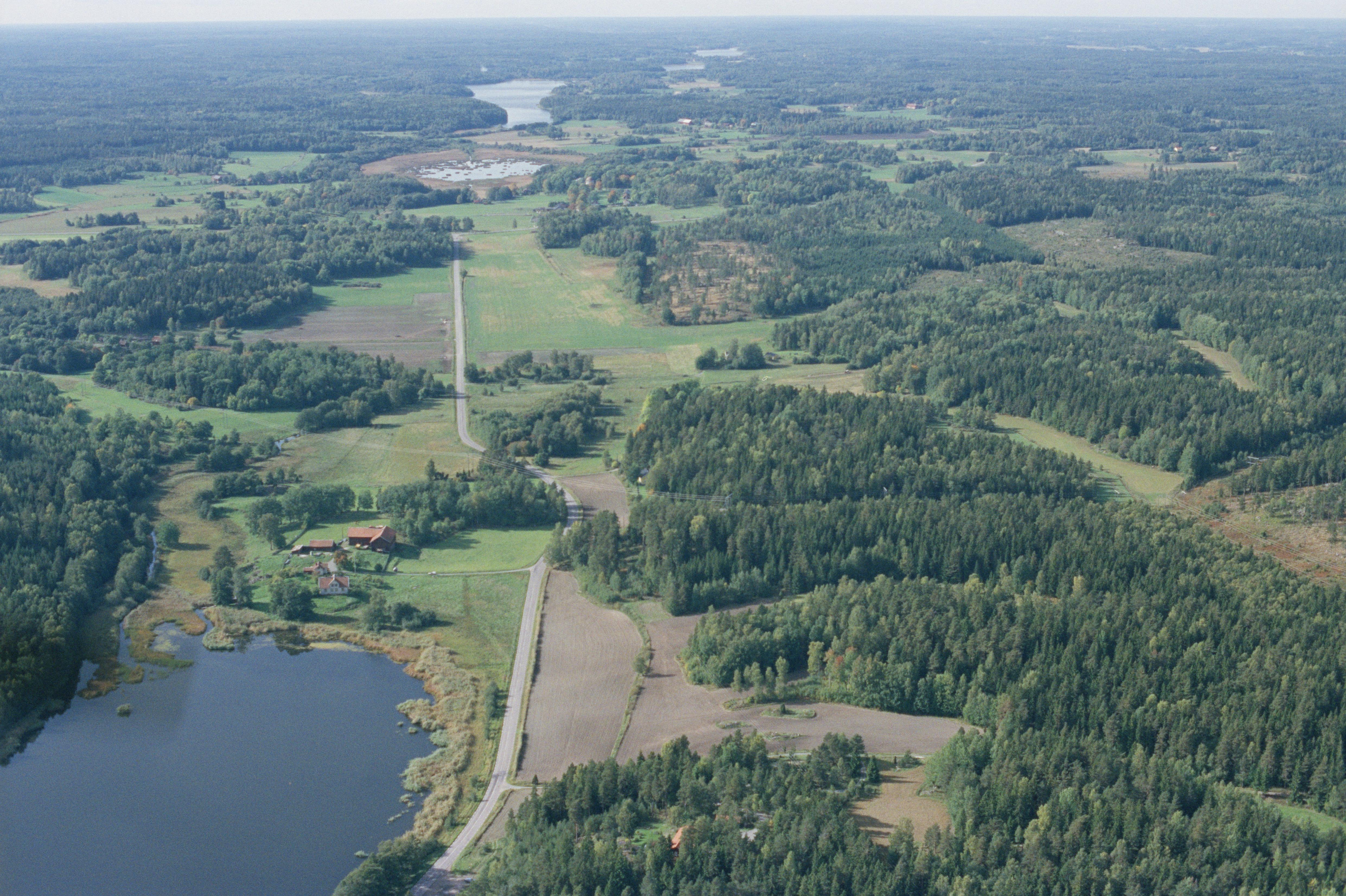 Beskrivning: Penningbyån i Penningbydalen. I bildens nedre del Fiskarudden. Borgruin Estängen RAÄnr Länna 71:1 vid bildens mitt. Bilden är tagen mot (väderstreck): V