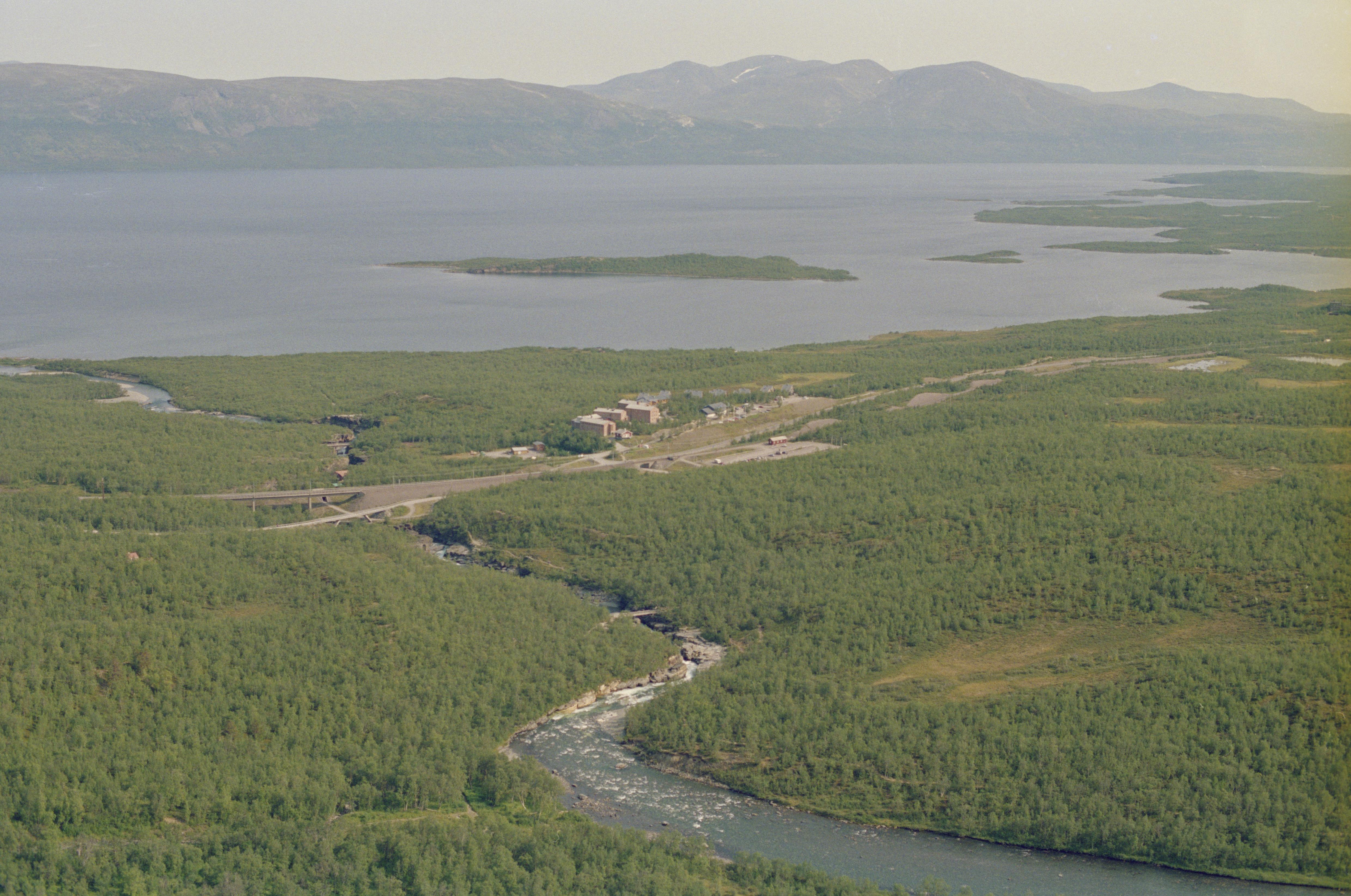Beskrivning: Vid bildens mitt västra delen av orten Abisko (Ábeskovvu). I bildens nedre del ån Abiskojåkka (Ábeskoeatnu). Vid ån fångstgropar RAÄnr Jukkasjärvi 495:1-2 m.m. Över bildens mitt järnvägen Ofotbanen (Ofotbanan / Malmbanan) längs sjön Torneträsk. Området ingår i Abisko nationalpark. Bilden är tagen mot (väderstreck): NO