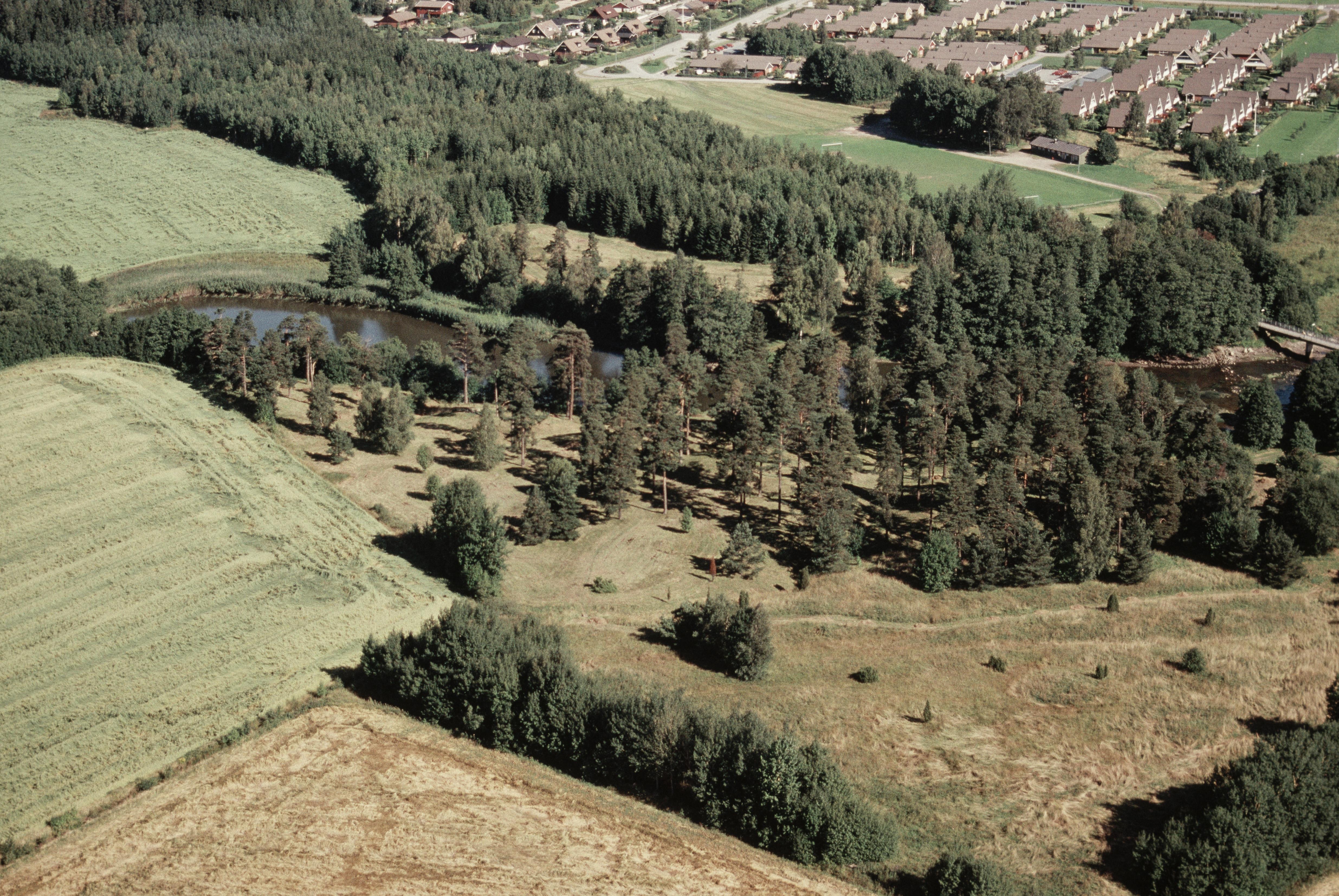 Beskrivning: Nyköpingsån vid Oppeby markerar gränsen mellan socknen Nyköping och Helgona (i bildens övre del). Hålvägar, vadställe och gravfält Släbro hage RAÄnr Nyköping 5:1. Bilden är tagen mot (väderstreck): NNO
