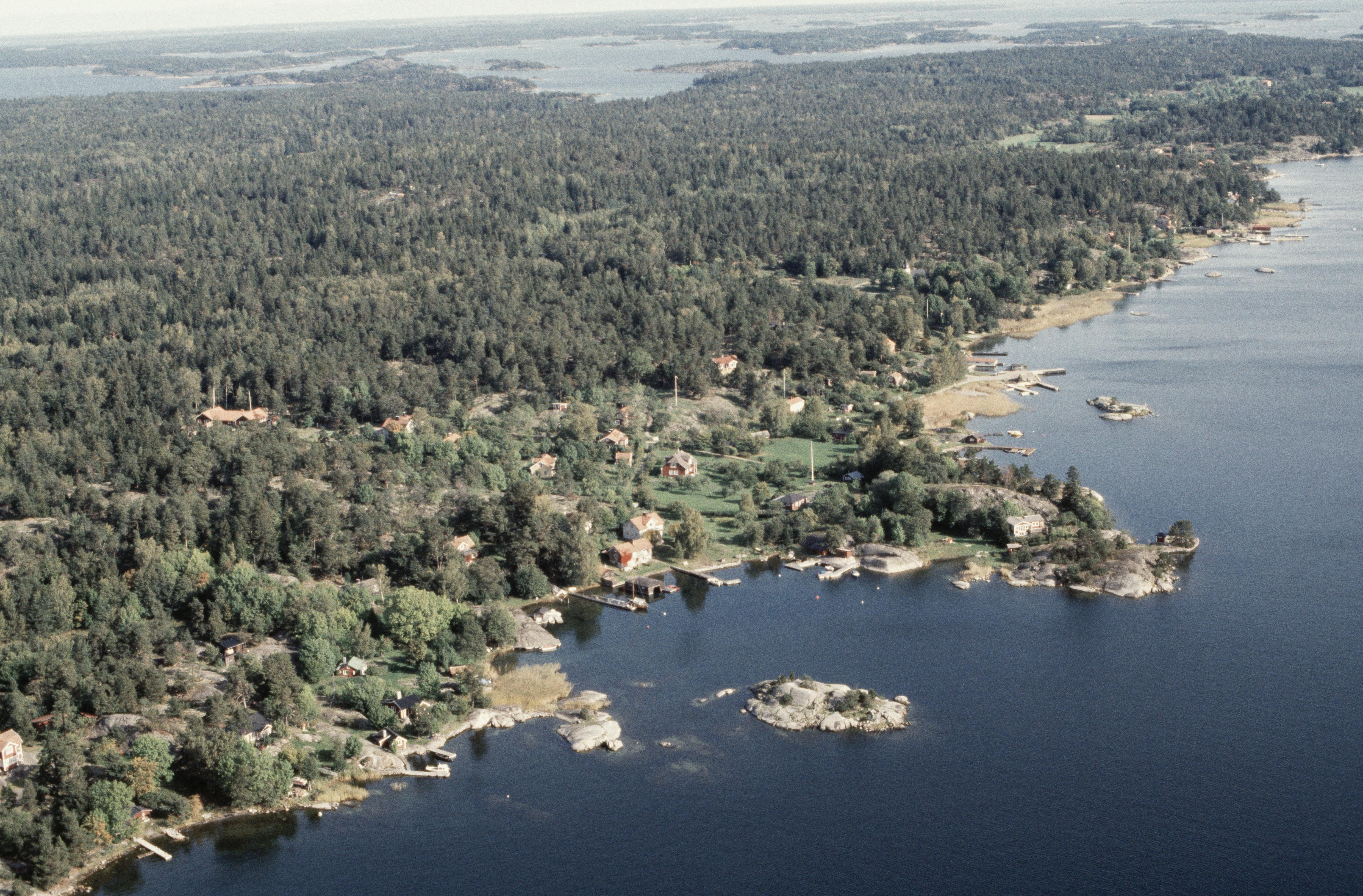 Beskrivning: Ön Nämdö, sydvästra delen vid Orröströmmen i Nämdöfjärden. I bildens nedre del byn Sand. Över bildens mitt Nämdö kyrka. Bilden är tagen mot (väderstreck): ONO