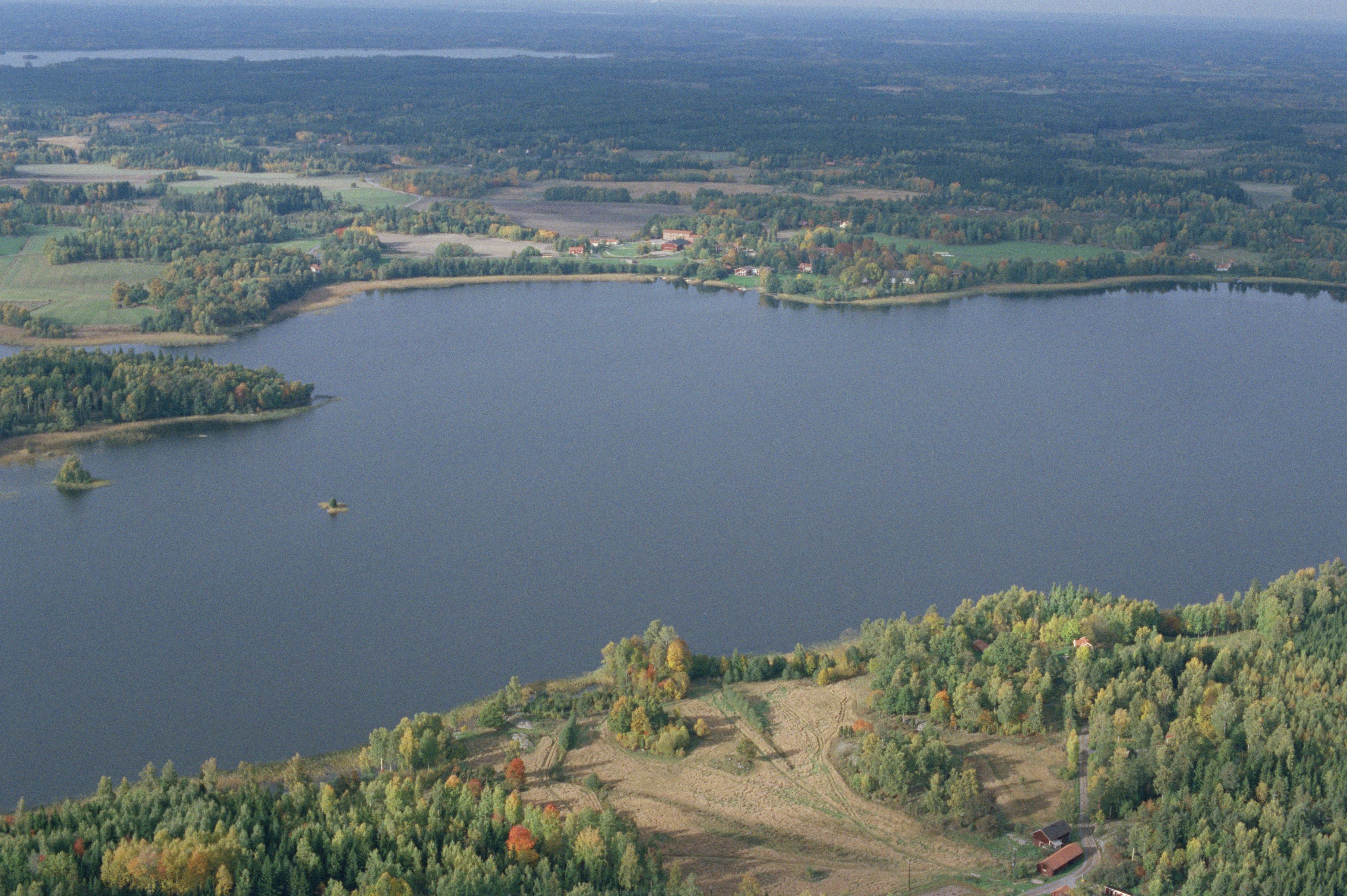 Beskrivning: Näshultasjön. Torpen Sjöstugan, Olstorp och Heden i bildens nedre del. Uppe till vänster Hedensö Ladugård och Killingnäset vid Brofjärden. Över bildens mitt Näshulta kyrka och kyrkby på Klockudden. Bilden är tagen mot (väderstreck): N