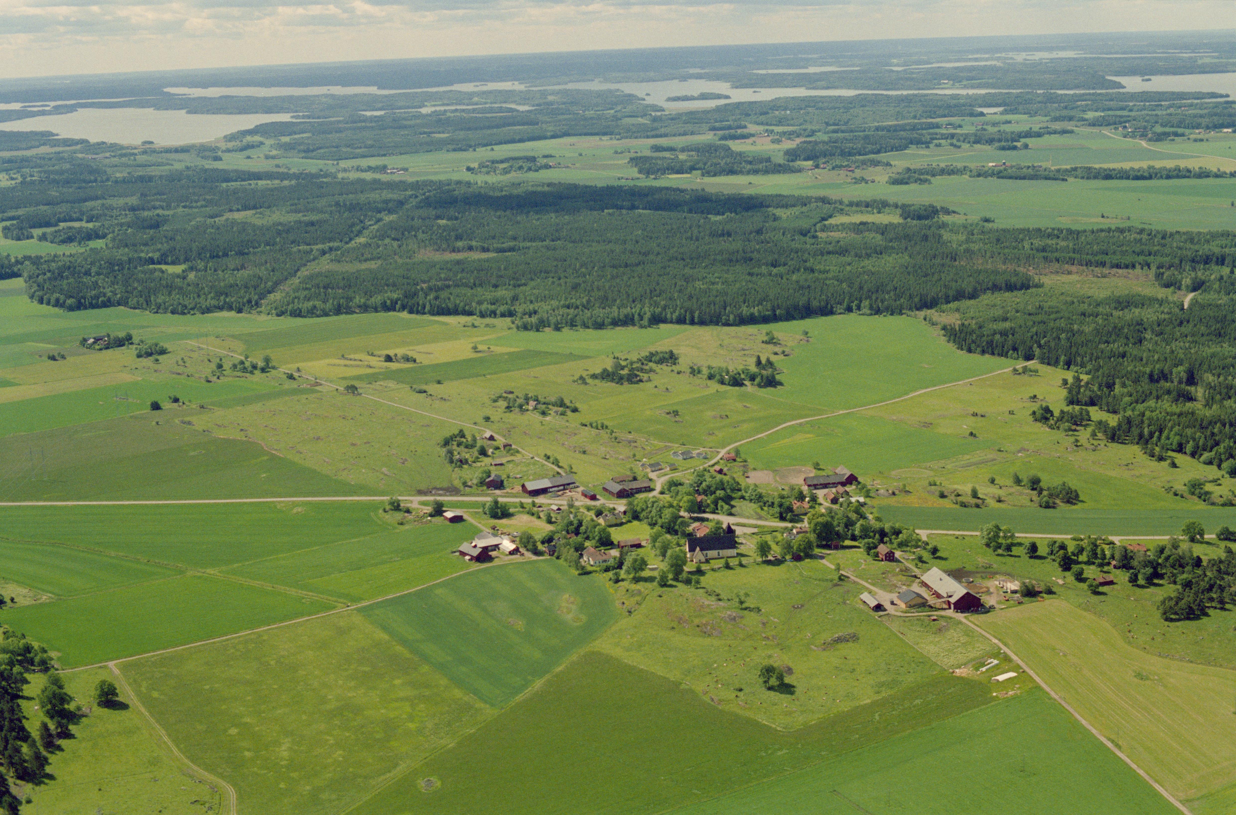 Beskrivning: I bildens nedre del till höger område med hällristningar RAÄnr Boglösa 172:1-7. Vid bildens mitt Boglösa kyrka och kyrkby. I bildens övre del socknen Lillkyrka, Vallby, Kungs-Husby m.fl. mot Stabyfjärden i Mälaren. Bilden är tagen mot (väderstreck): S
