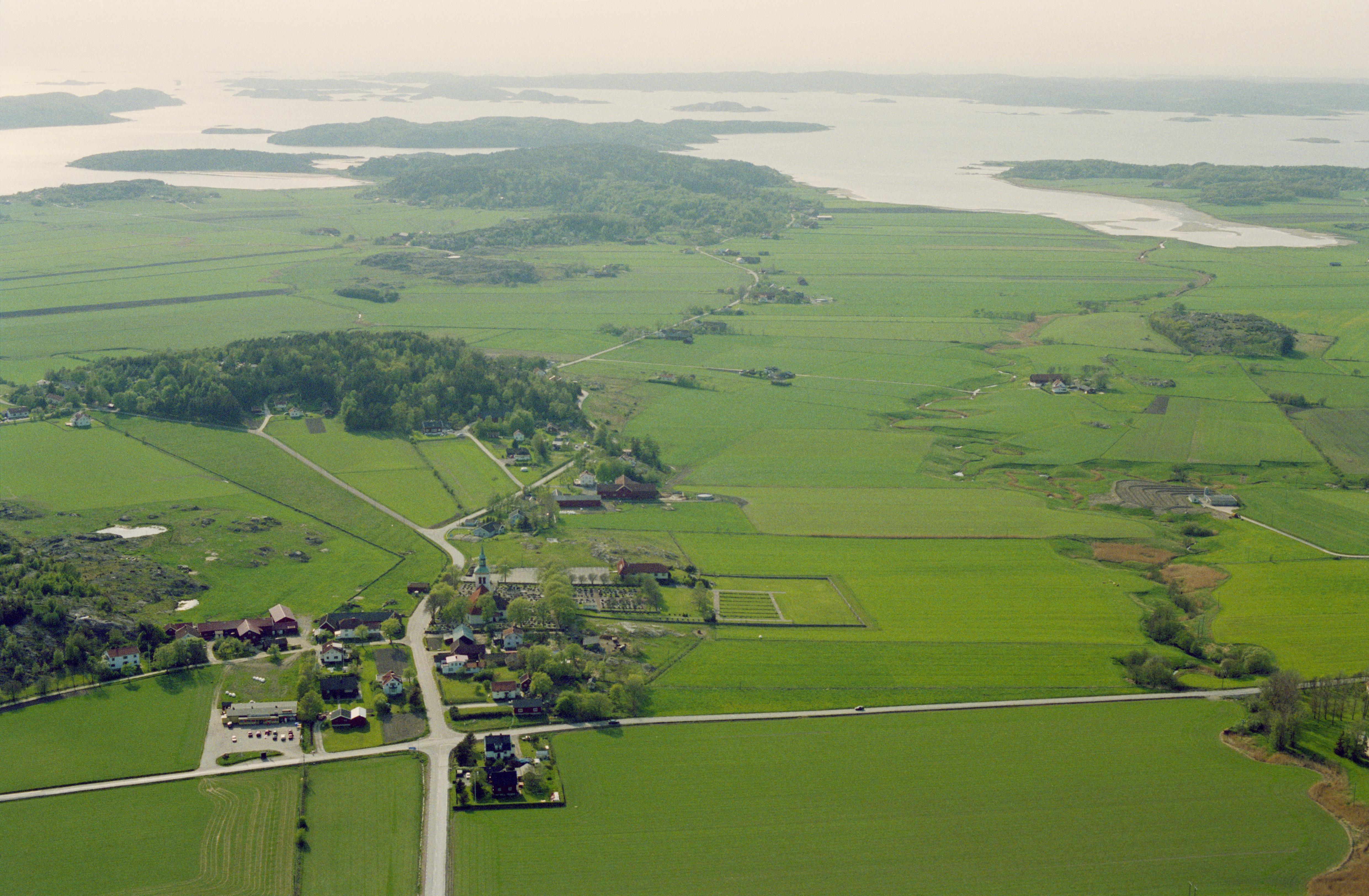 Beskrivning: Solberga kyrka och kyrkby i Vallbyåns dalgång. I bildens övre del Vallby och vikarna Ödsmål kile och Vallby kile. Bilden är tagen mot (väderstreck): VNV