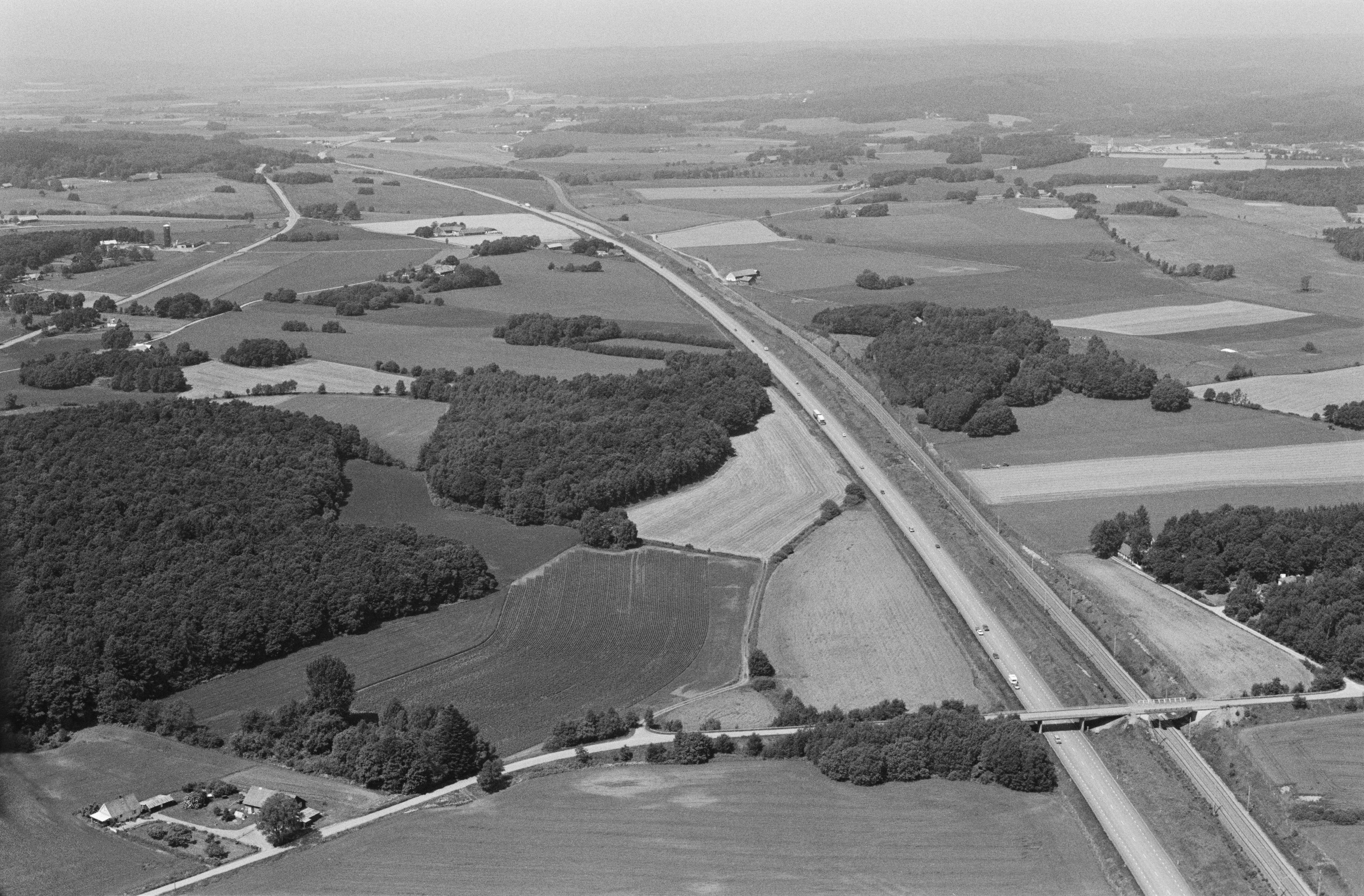 Beskrivning: Innan bygge av väg E6 mellan Laholm och Slöinge. Boplats RAÄnr Holm 114:1 vid bildens mitt. Ekelund nere till vänster. I bildens övre del Kvibille socken. Bilden är tagen mot (väderstreck): N