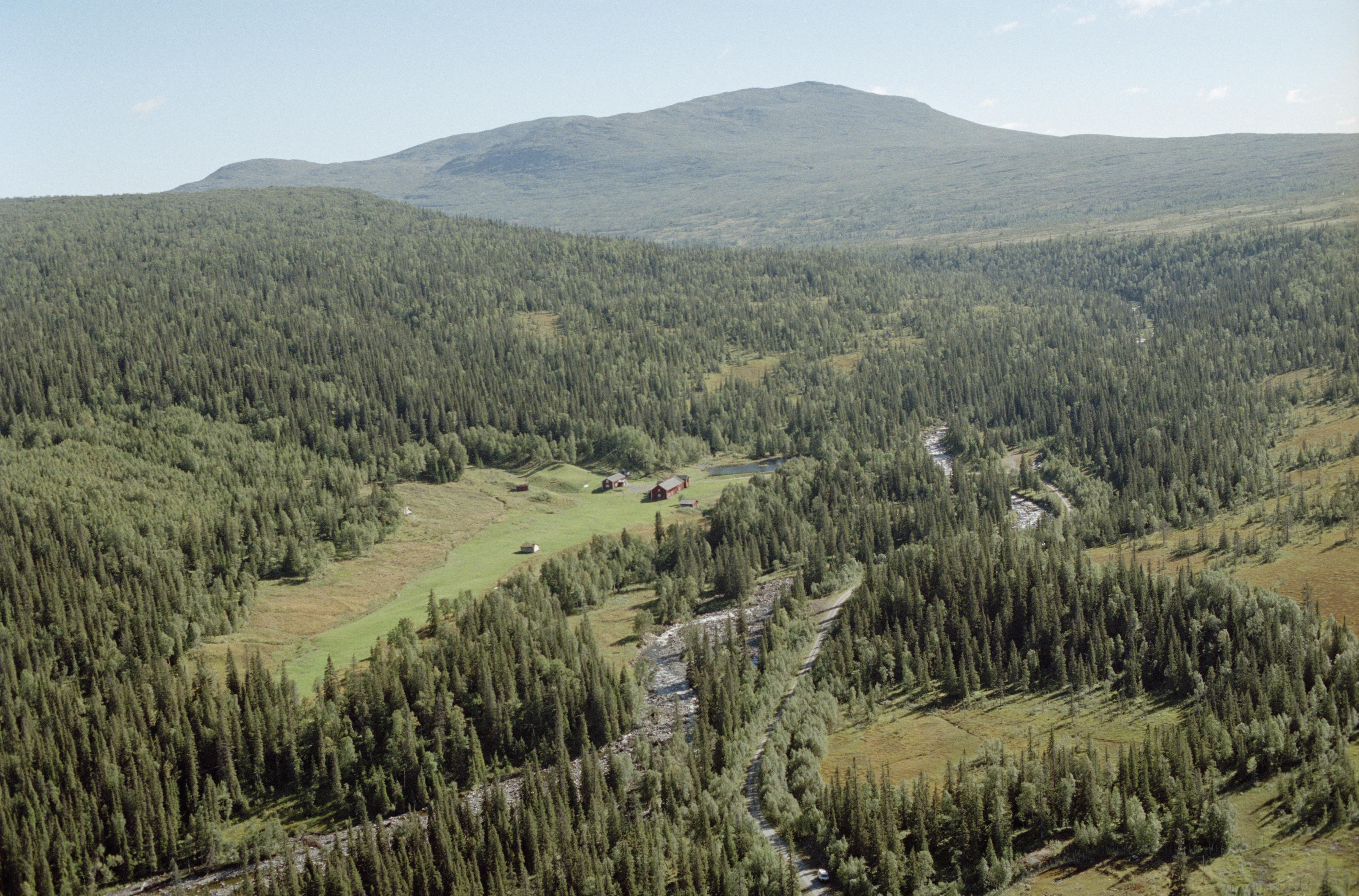 Beskrivning: Vid bildens mitt ensamgården Väktarmon vid Väktarån. Gården är intill Väktardalens naturreservat. I skogen över bildens mitt sjön Stor-Väktaren mot fjället Gulliken (Göölehtstjahke). Bilden är tagen mot (väderstreck): SO