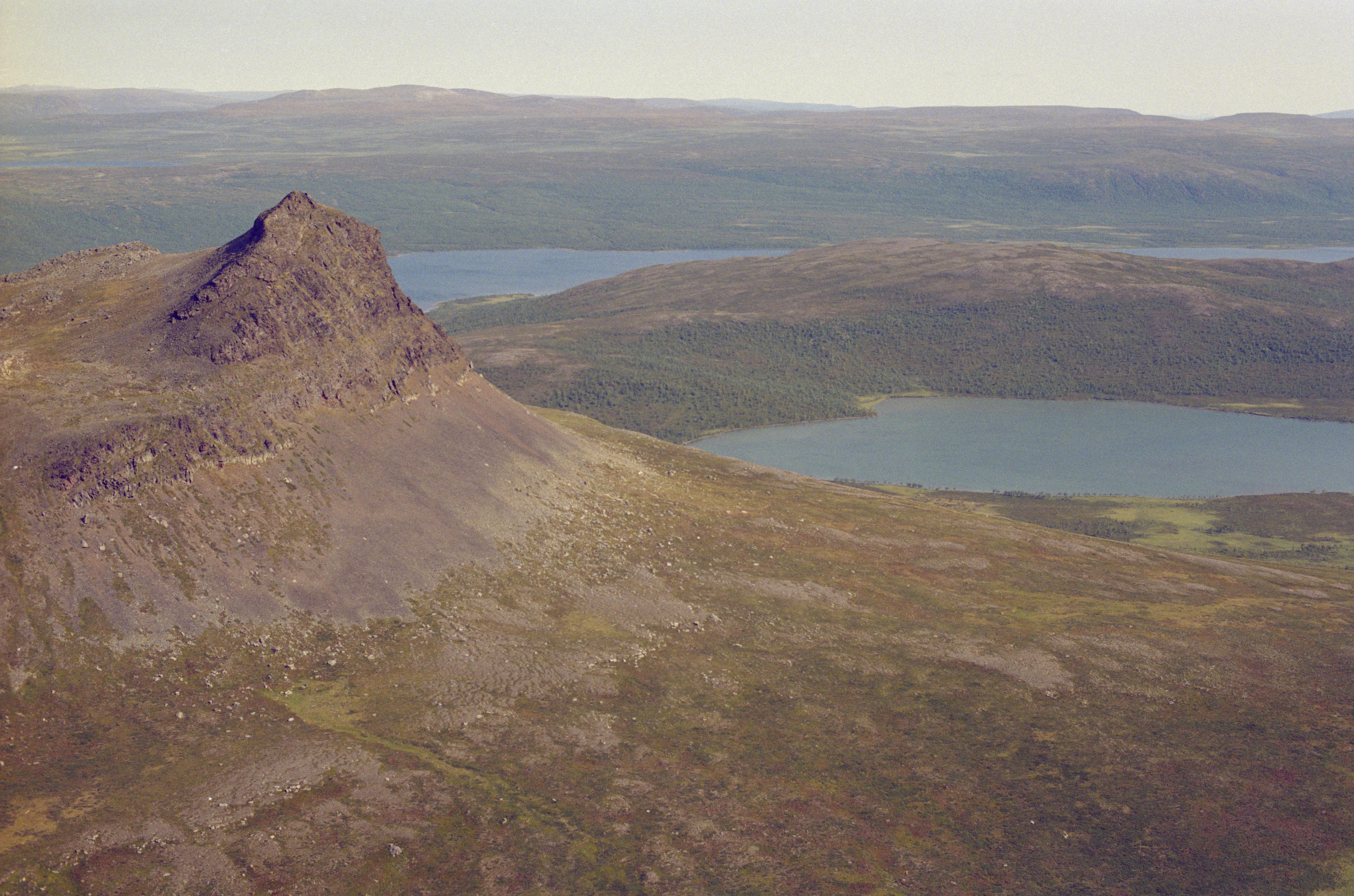 Beskrivning: Till vänster fjället Akkavare (Áhkávárri) med offerplats RAÄnr Gällivare 60:1. Till höger om bildens mitt sjön Läffasaiva (Laeffásáiva) med visten, fiskeseite och offerplats RAÄnr Gällivare 59:1 vid berget Muovlak. I bildens övre del sjön Vuoleo Kaitumjaure (Vuolip Gáidumjávri). Sjaunja naturreservat. Bilden är tagen mot (väderstreck): NO