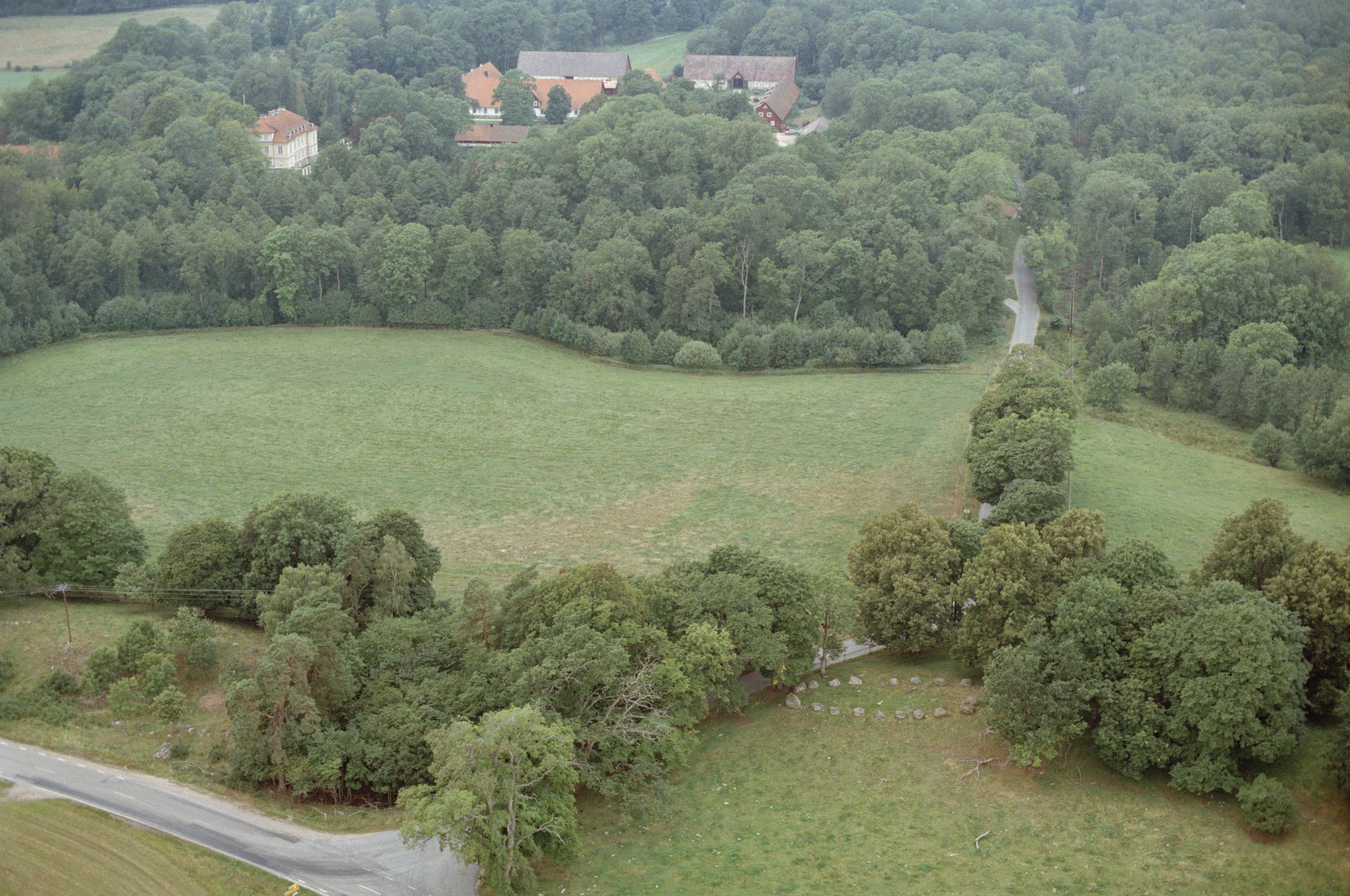 Beskrivning: Gravfält och skeppssättning RAÄnr Hjortsberga 36:1-2 och 37:1 vid naturreservatet Johannishus åsar. Johannishus slott i bildens övre del. Bilden är tagen mot (väderstreck): V