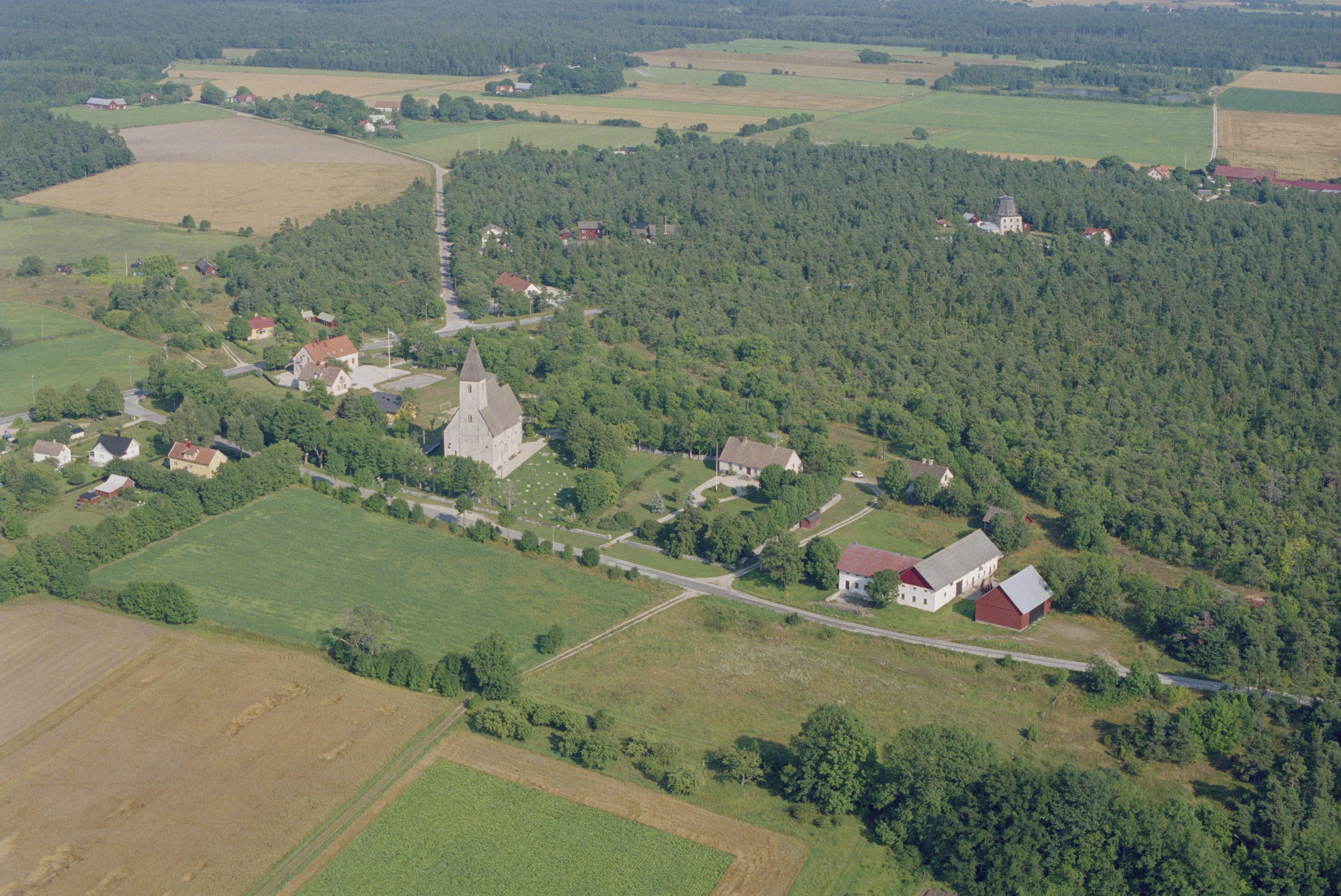 Beskrivning: Endre kyrkby. Endre skola och Endre kyrka till vänster om bildens mitt. Till höger om kyrkan en sten med tradition RAÄnr Endre 61:1. Endre kvarn uppe till höger. Bilden är tagen mot (väderstreck): ONO