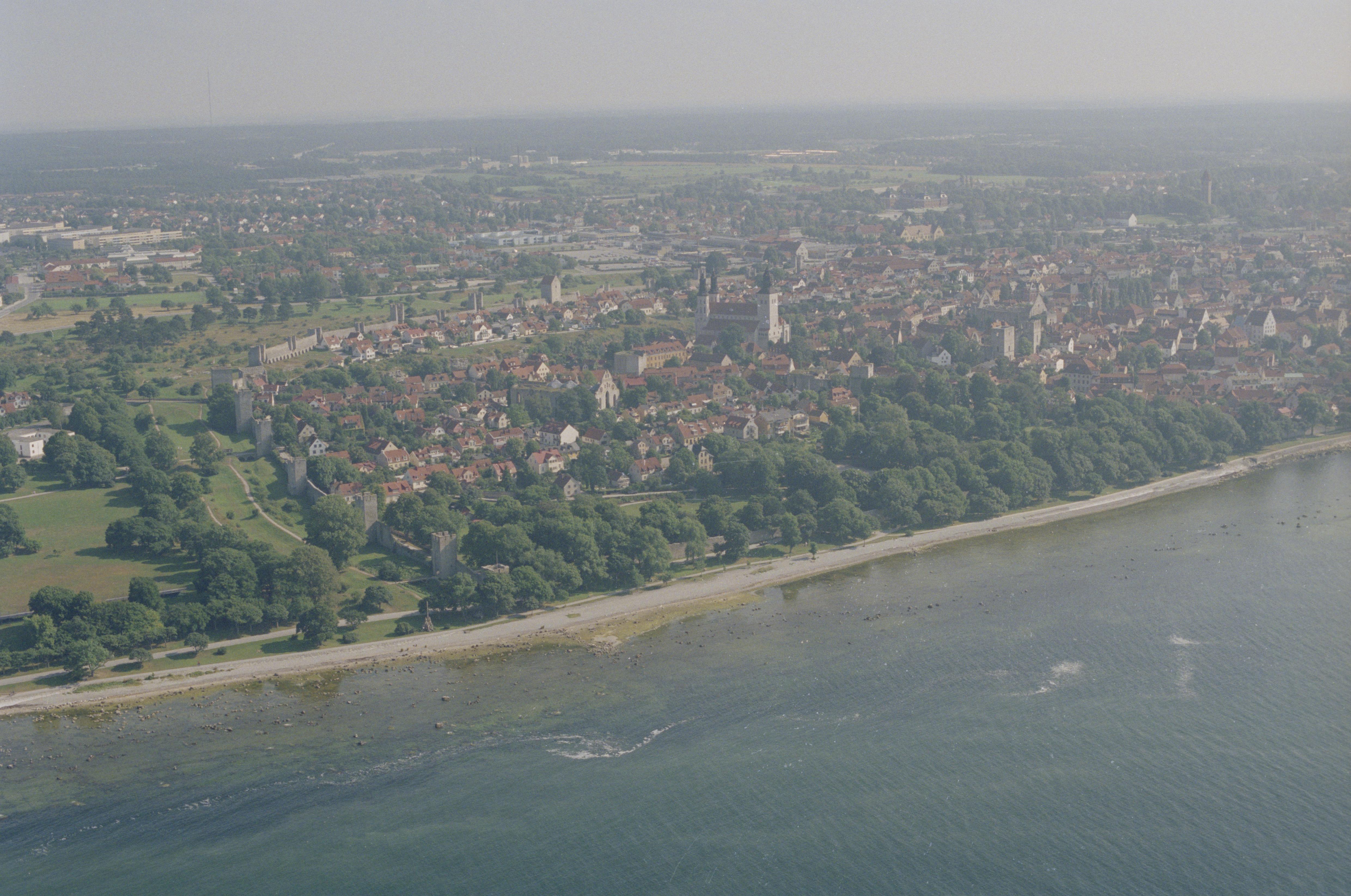 Beskrivning: Visby stad. Visby innerstad med Visby ringmur i stadslager RAÄnr Visby 107:1. Till vänster om bildens mitt kyrkoruinerna Sankt Nikolaus RAÄnr Visby 53:1, Sankt Klemens RAÄnr Visby 56:1, Helgeands RAÄnr Visby 55: m.fl. Till höger Visby domkyrka, Sankta Katarina kyrkoruin RAÄnr Visby 57:1 m.fl. Bilden är tagen mot (väderstreck): SO