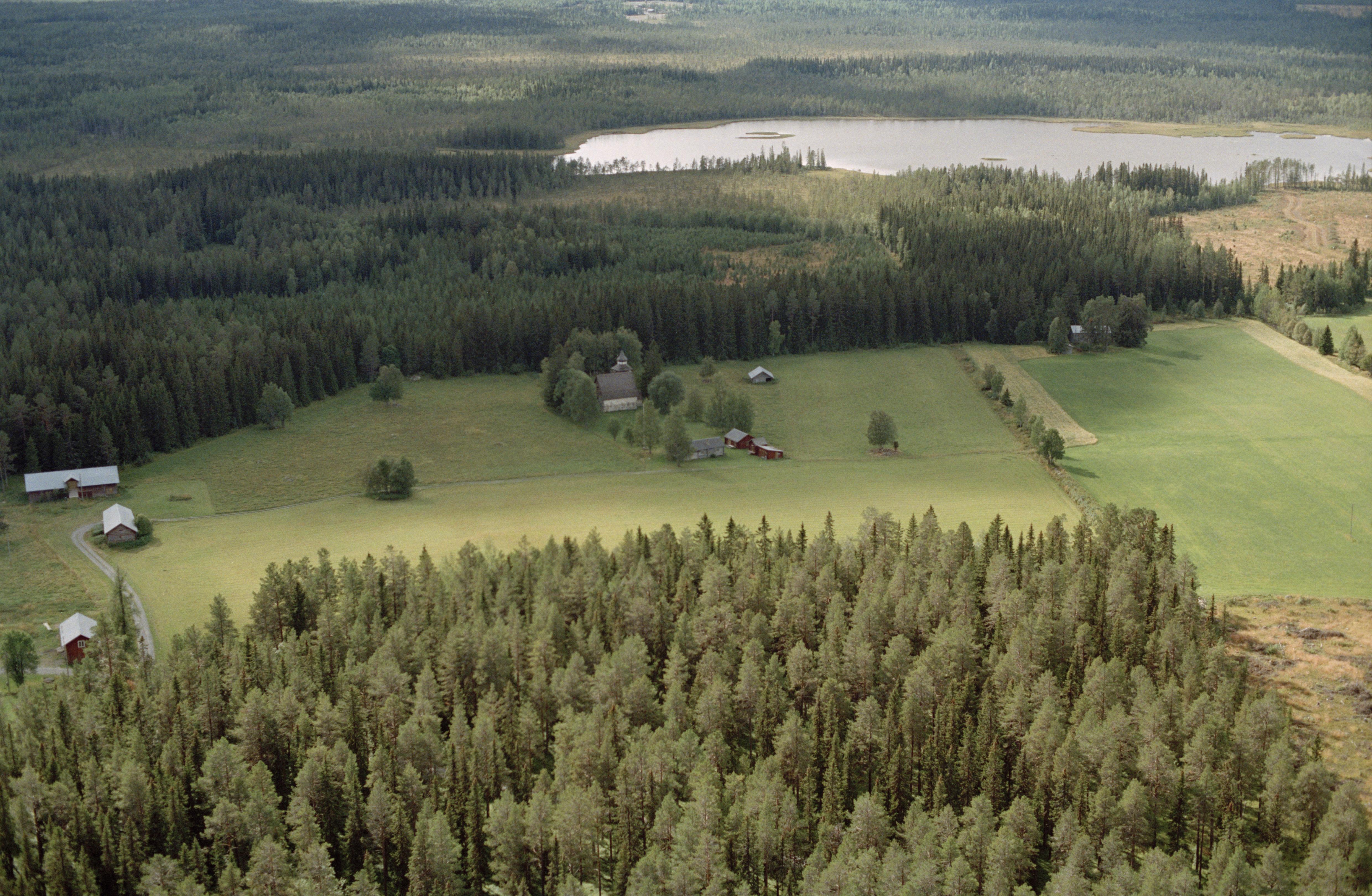 Beskrivning: Kyrkås gamla kyrka och hembygdsgård. Vid kyrkan fossil åker RAÄnr Kyrkås 107:1. Gällsjön uppe till höger. Bilden är tagen mot (väderstreck): SV