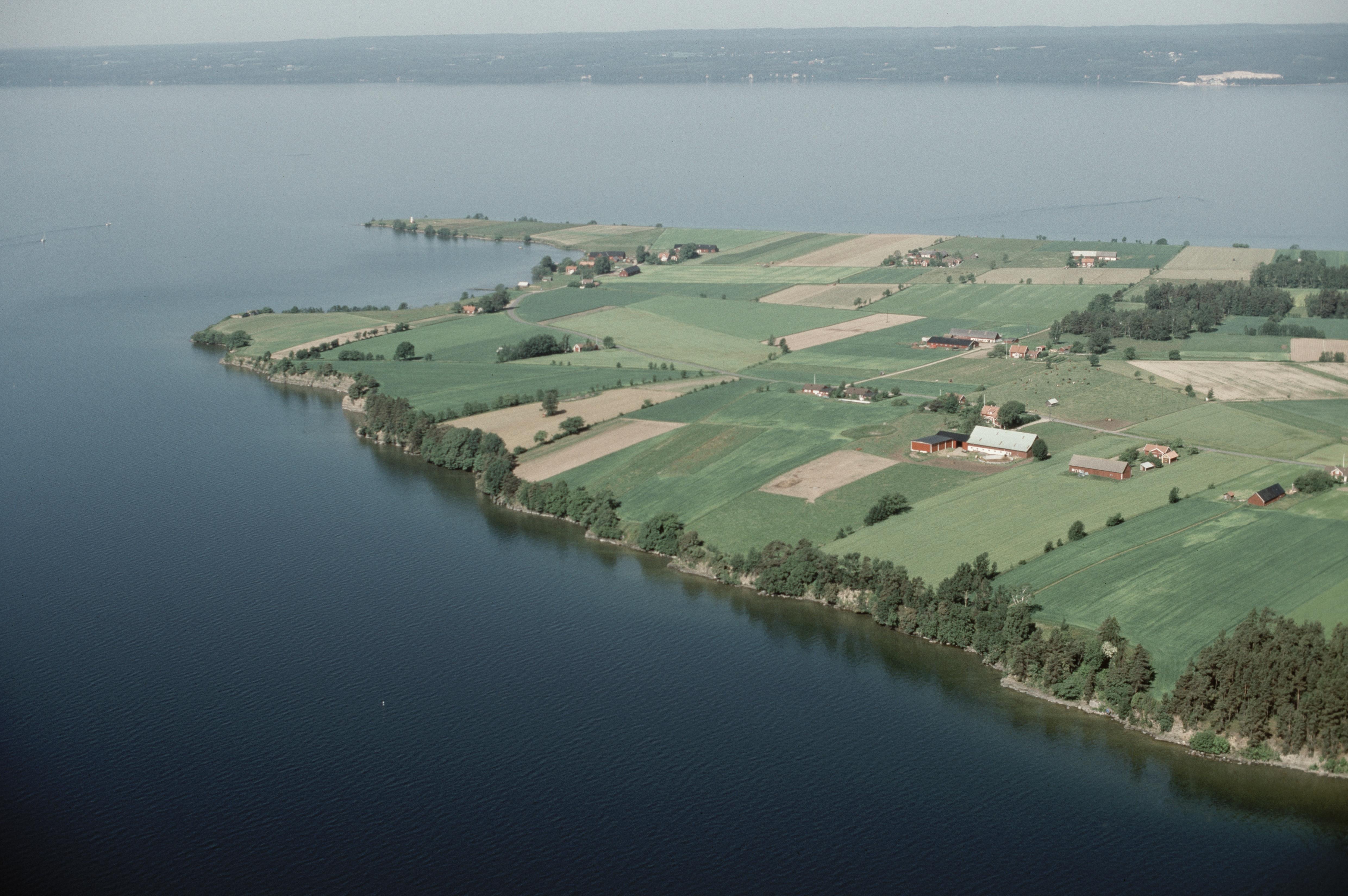 Beskrivning: Visingsö, södra delen. Uppe till vänster Näs slottsruin RAÄnr Visingsö 72:1. Bilden är tagen mot (väderstreck): SV