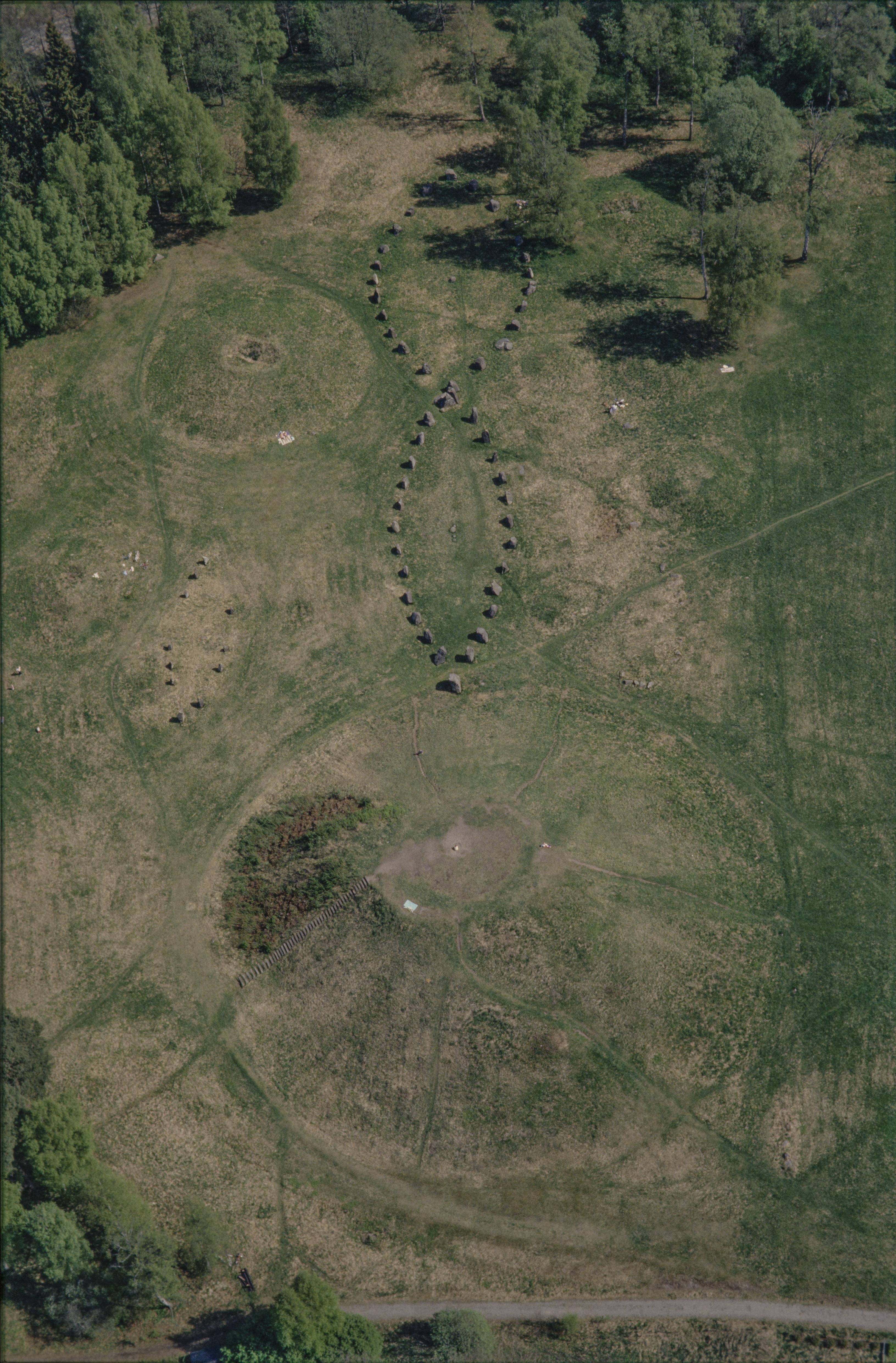 Beskrivning: Fornlämningsområdet Anundshög RAÄnr Västerås 431:1 vid Badelundaåsen i Badelunda. I området finns storhög, skeppssättningar, väglämningar och runsten m.m. Bilden är tagen mot (väderstreck): ONO