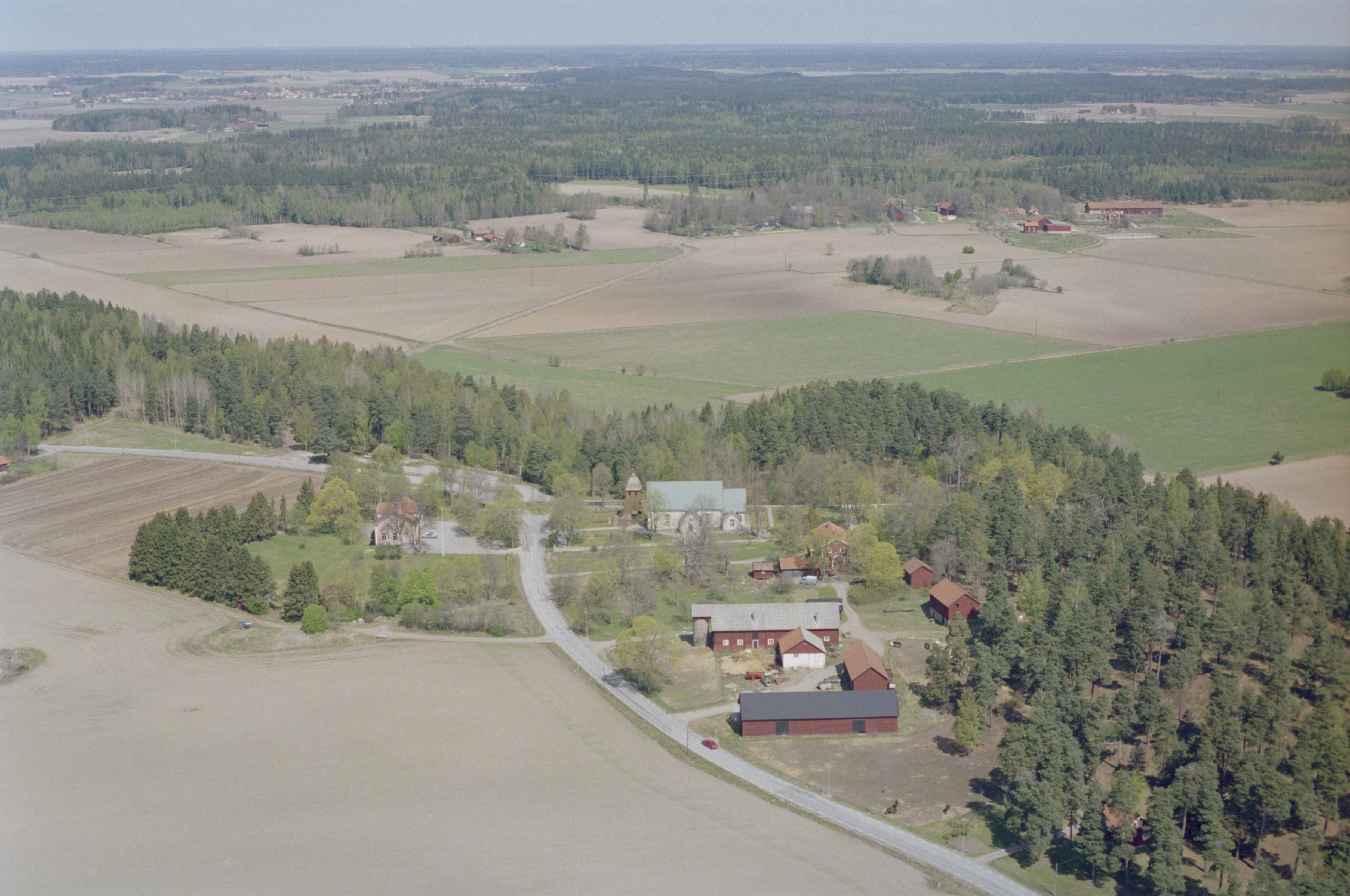Beskrivning: Badelunda kyrka och prästgård vid Badelundaåsen och Badelunda naturreservat. Vid kyrkan boplats RAÄnr Västerås 1040:1. Bilden är tagen mot (väderstreck): N