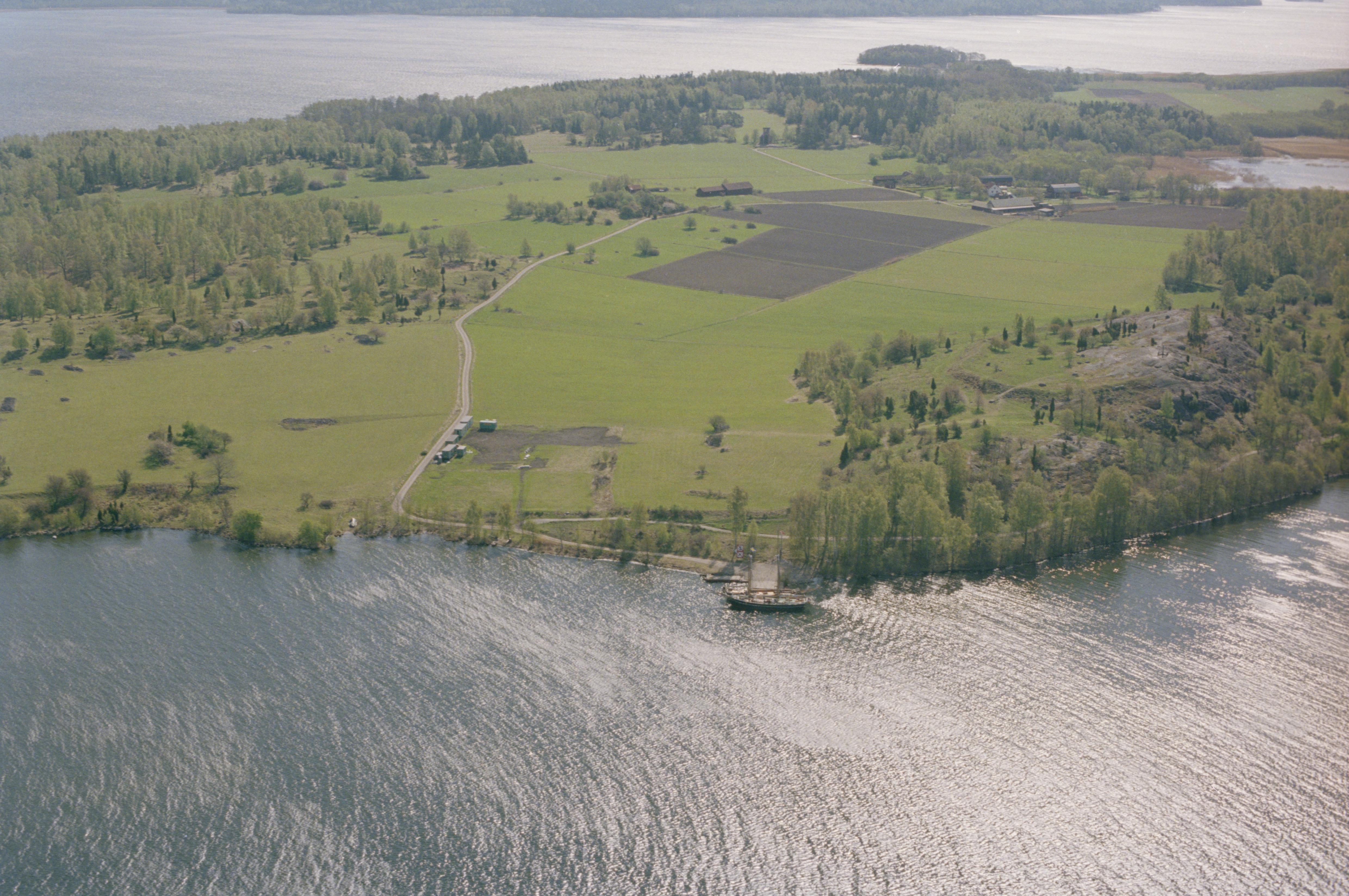Beskrivning: Fornlämningsområdet Birka på Björkö i Mälaren. Vid bildens mitt arkeologisk undersökning vid bo- och gravplats Hemlanden och Svarta jorden RAÄnr Adelsö 118:1 vid Stadsvallen Adelsö 119:1-2 . Till höger fornborg Borg Adelsö 34:1 m.fl. Över bildens mitt Björkö by. Bilden är tagen mot (väderstreck): OSO