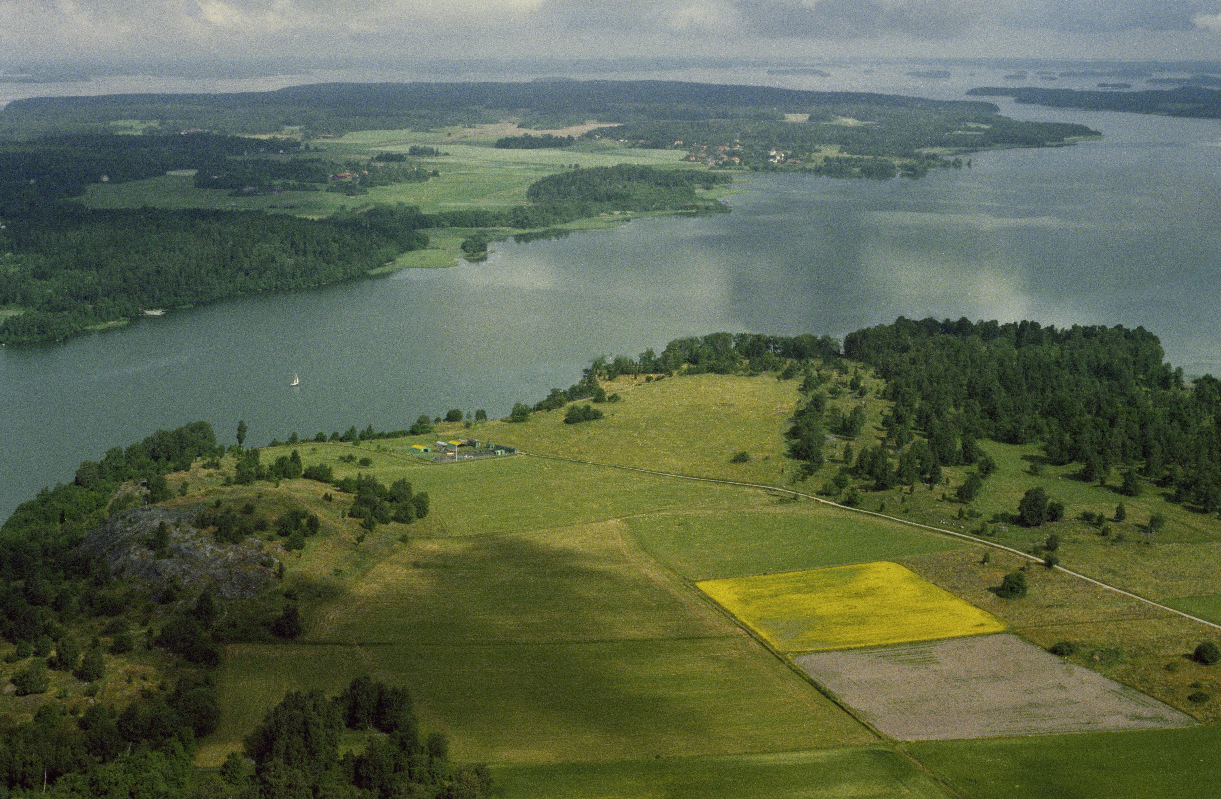 Beskrivning: Fornlämningsområdet Birka på Björkö i Mälaren. Till vänster om bildens mitt arkeologisk undersökning i norra delen av ön i bo- och gravplats Hemlanden och Svarta jorden RAÄnr Adelsö 118:1 vid Stadsvallen Adelsö 119:1-2. Adelsön i bildens övre del. Bilden är tagen mot (väderstreck): N