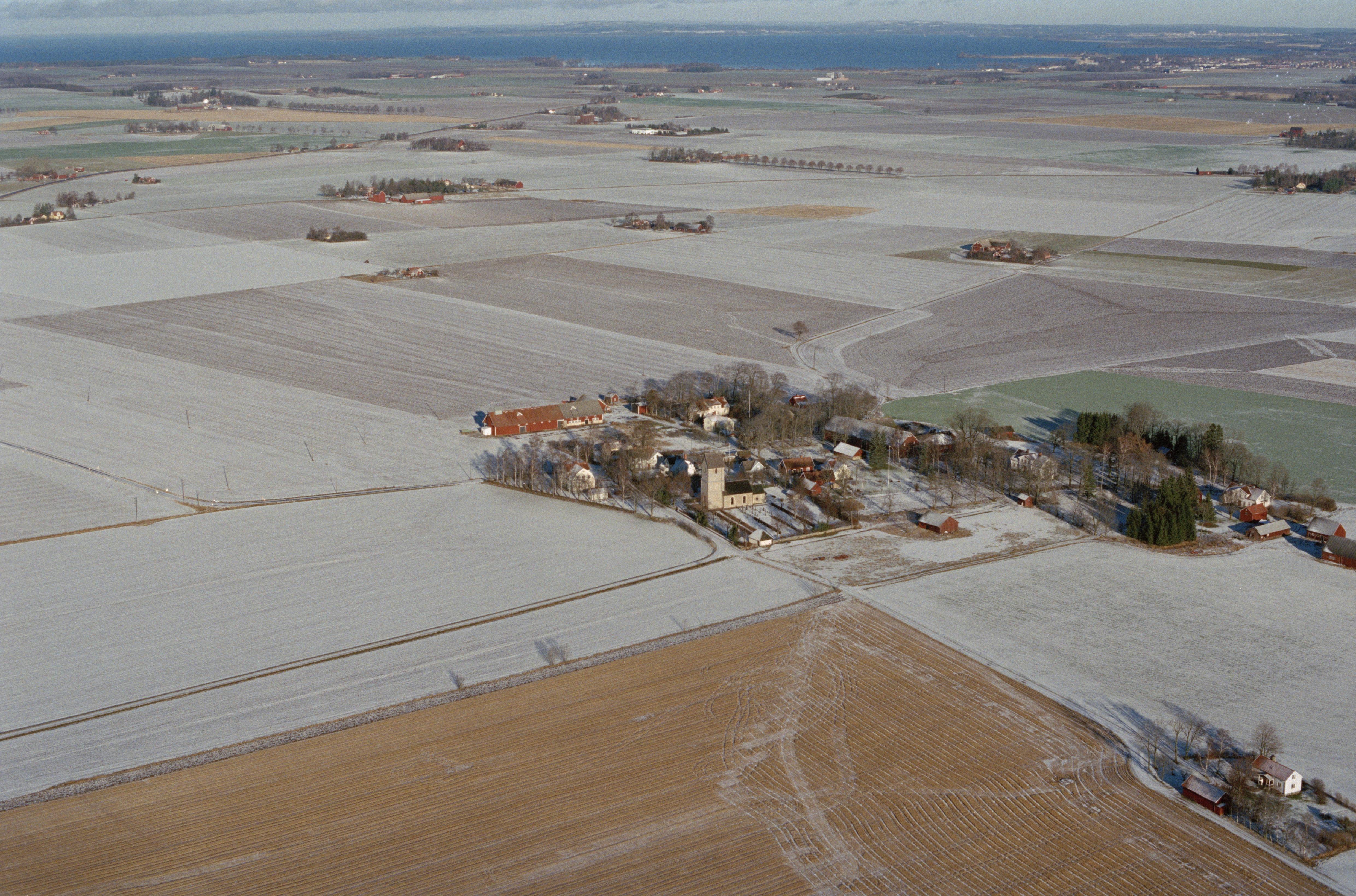 Beskrivning: Herrestads kyrka och kyrkby. Bilden är tagen mot (väderstreck): N