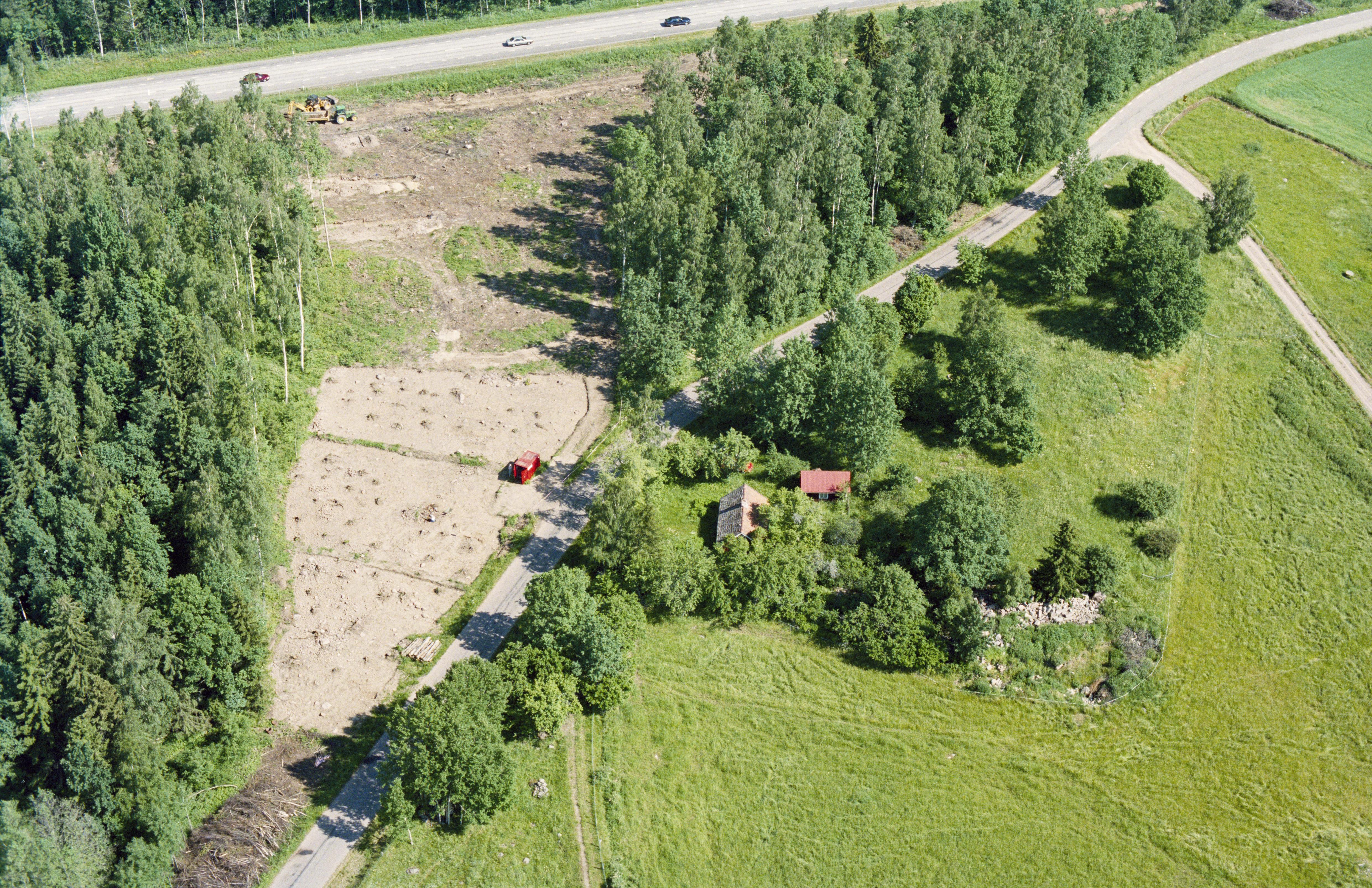 Beskrivning: Arkeologisk undersökning innan bygging av väg E4, vid gränsen mot socknet Rinna (i bildens nedre del) vid Mörby och Jordsfälle by. Vid bildens mitt hägnad och fossil åker RAÄnr Hogstad 166:1-2. Bilden är tagen mot (väderstreck): NNO