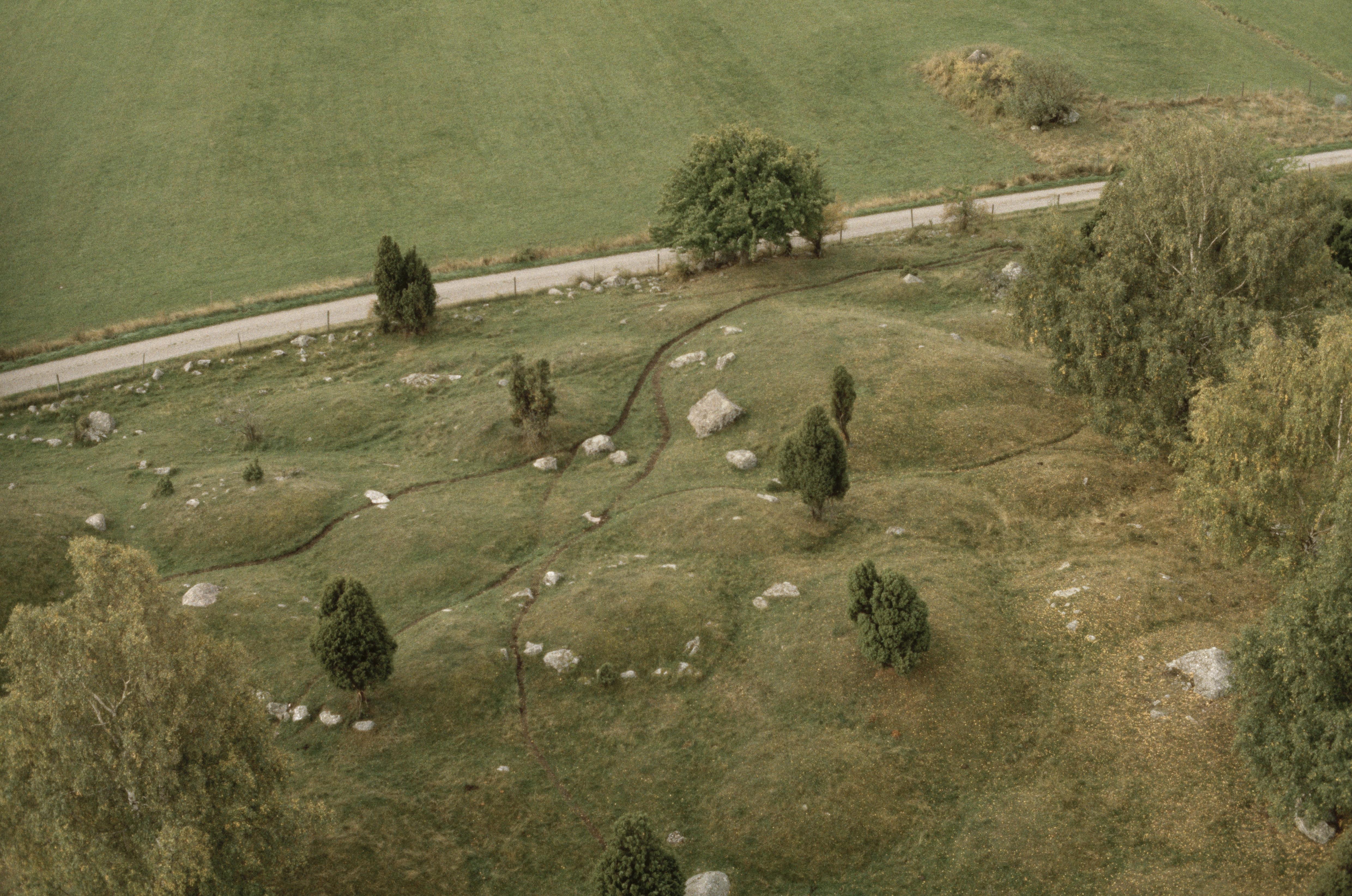 Beskrivning: Fornlämningsområdet Birka på Björkö i Mälaren. Bo- och gravplats Hemlanden och Svarta jorden RAÄnr Adelsö 118:1 vid Stadsvallen Adelsö 119:1-2. Stigar i södra delen av gravfält Hemlanden. Bilden är tagen mot (väderstreck): SV