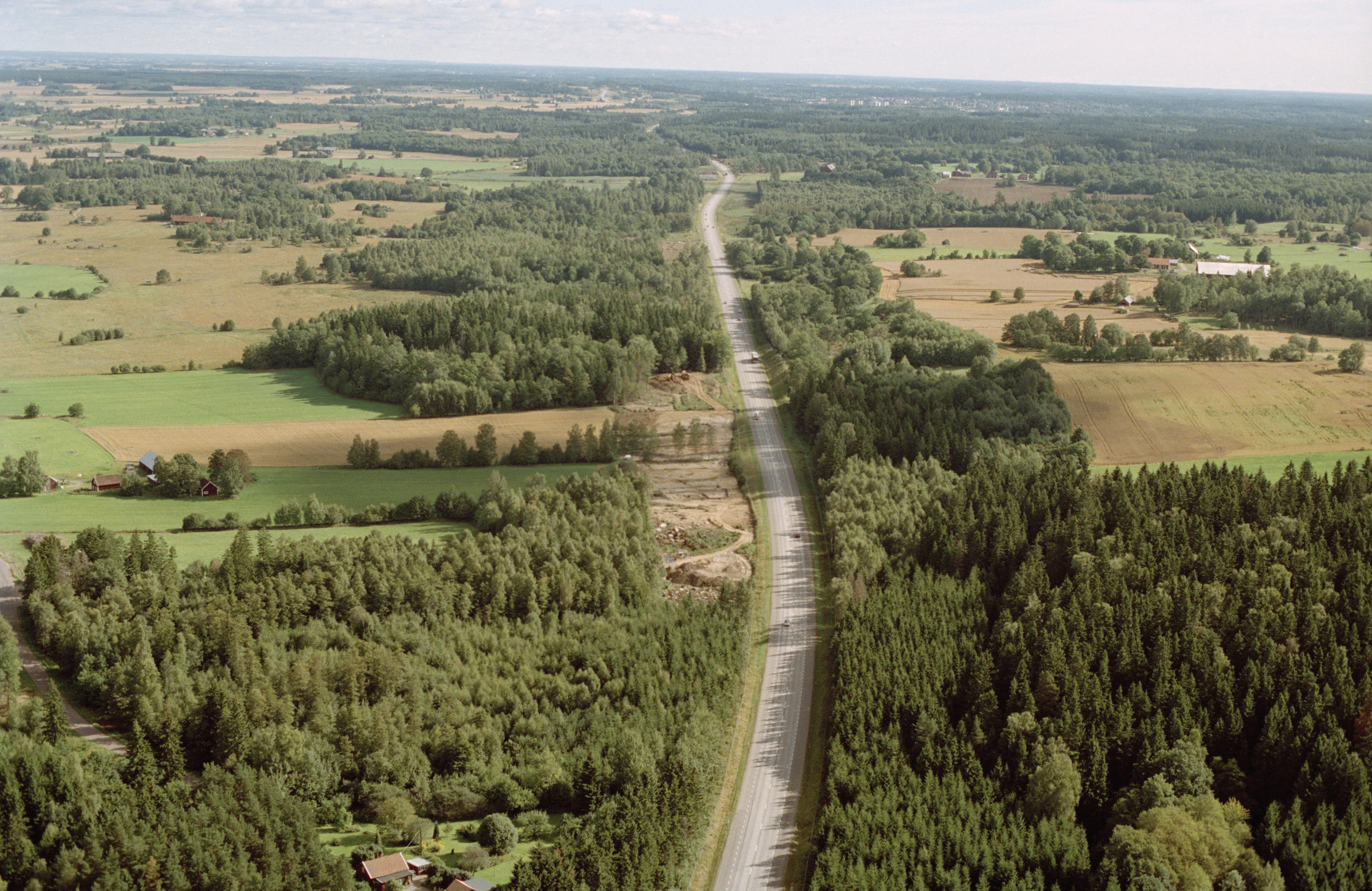 Beskrivning: Arkeologisk undersökning innan bygging av väg E4 i området Mörby, Jordsfälle, Stora och Lilla Ljuna. Boplats RAÄnr Hogstad 168:1 under bildens mitt. Bilden är tagen mot (väderstreck): Ö