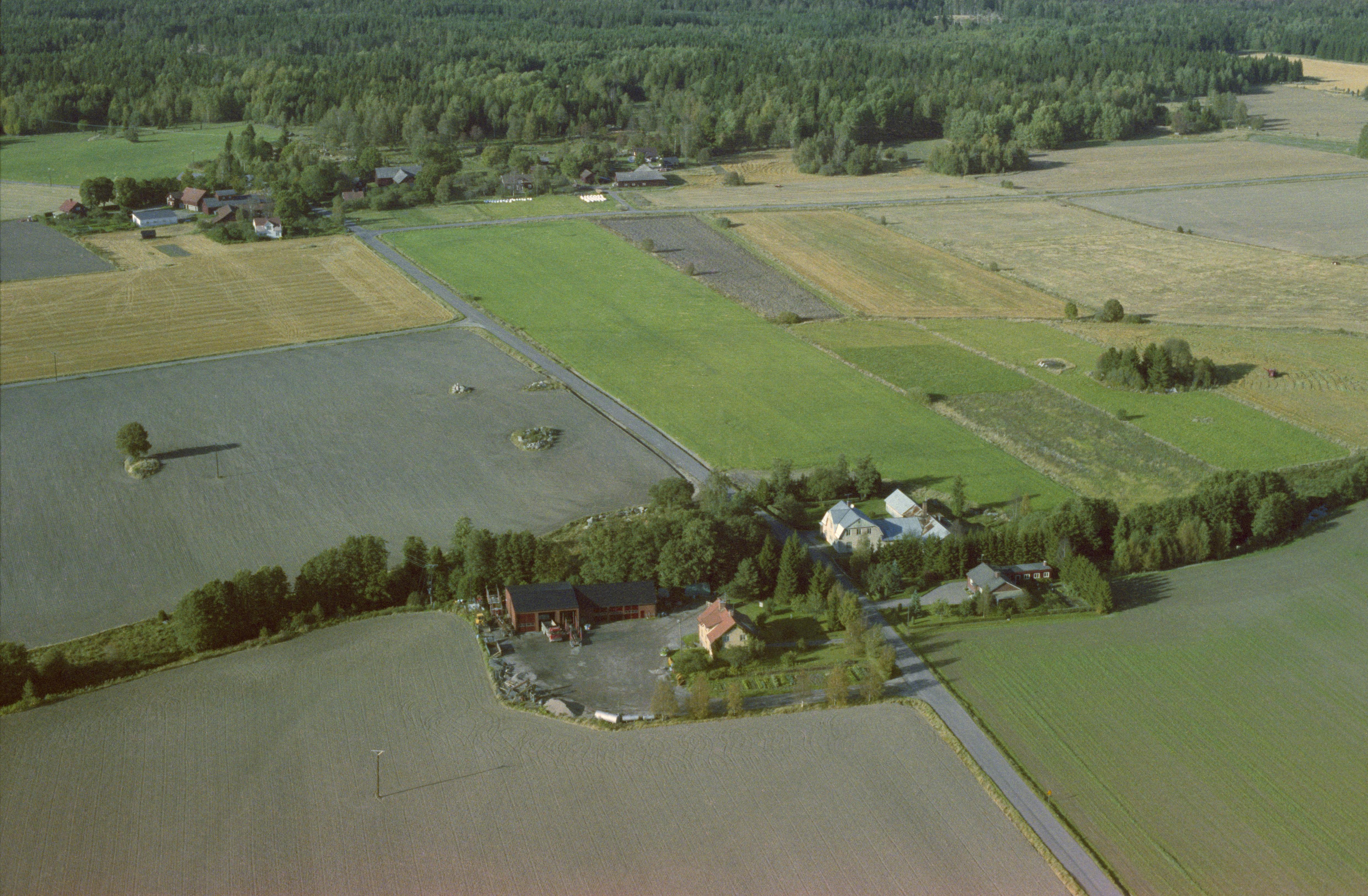 Beskrivning: Björklingeåns dalgång. Ån markerar gränsen mellan socknen Skuttunge (i bildens nedre del) och Björklinge (i bildens övre del). Vid bildens mitt Forsbybro by (i Skuttunge socken). I bildens nedre del gravfält RAÄnr Skuttunge 142:1. Bilden är tagen mot (väderstreck): N