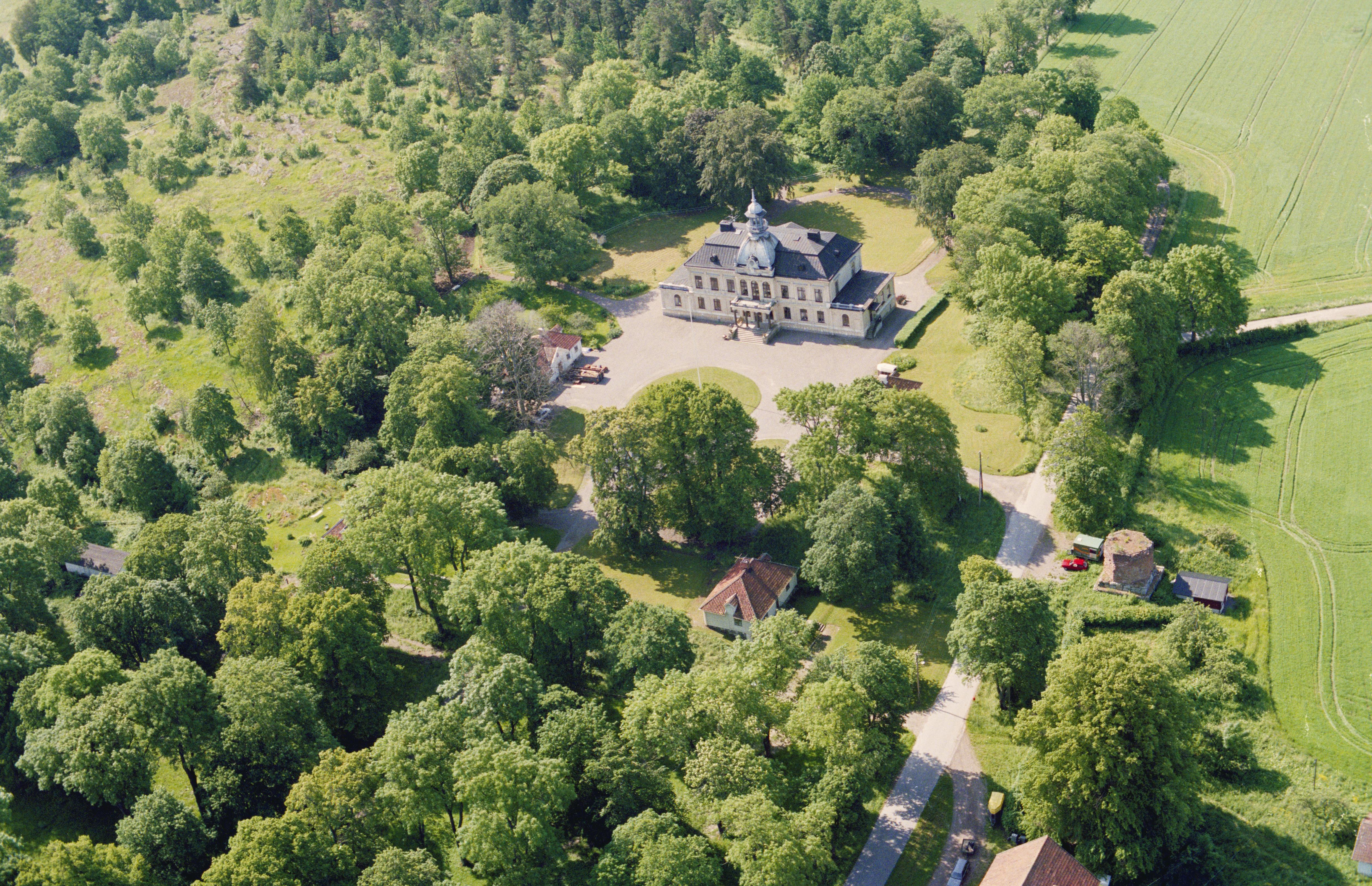 Beskrivning: Brogårds herrgård (skrivs även Bro Hof slott). Herrgården har underjordiska gångar till flygelbyggnaderna RAÄnr Bro 91:1. Bilden är tagen mot (väderstreck): S