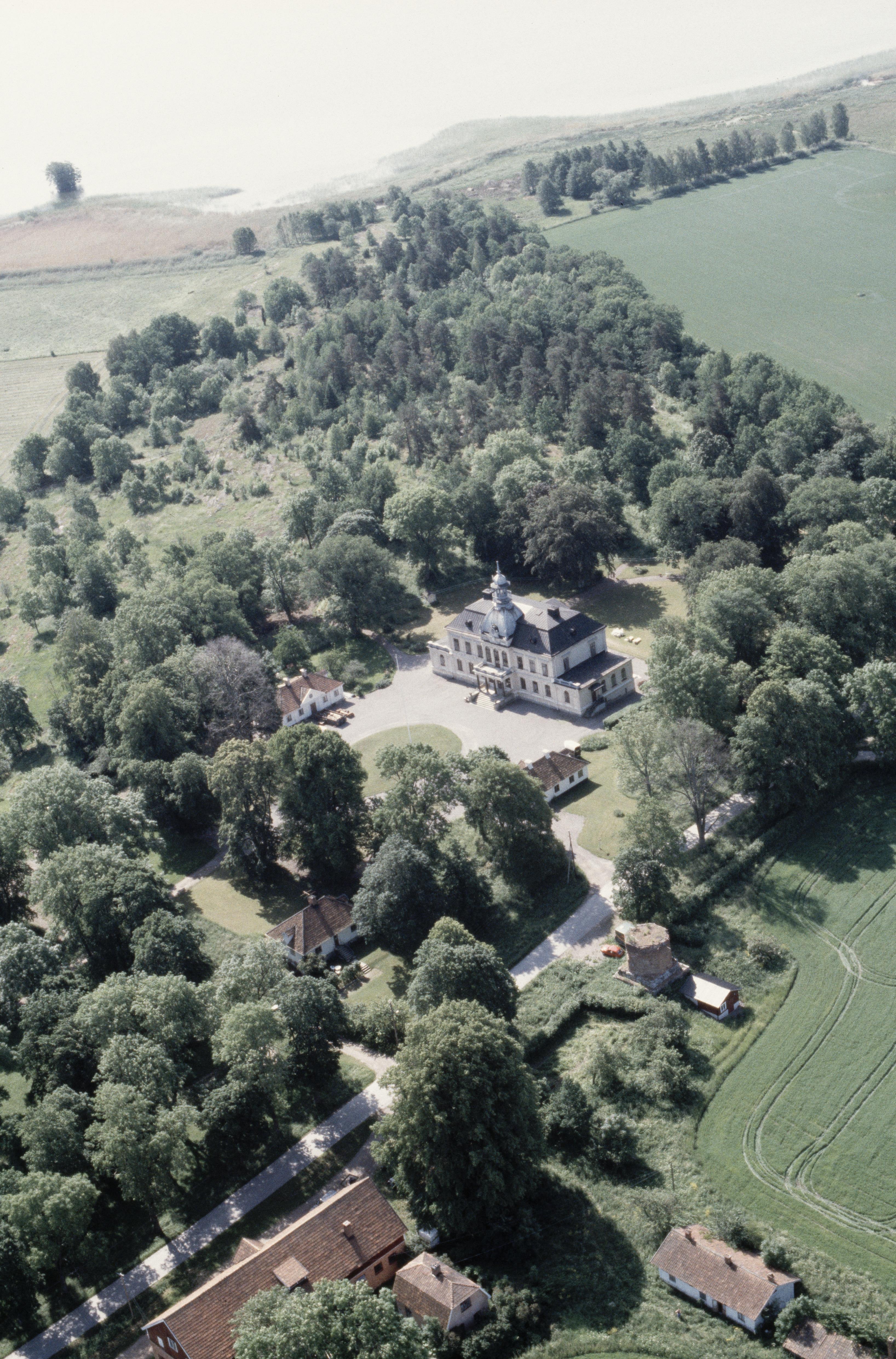 Beskrivning: Brogårds herrgård (skrivs även Bro Hof slott). Herrgården har underjordiska gångar till flygelbyggnaderna RAÄnr Bro 91:1. Brogårds herrgård (skrivs även Bro Hof slott). Herrgården har underjordiska gångar till flygelbyggnaderna RAÄnr Bro 91:1. I bildens övre del Brofjärden i Mälaren. Bilden är tagen mot (väderstreck): SSO