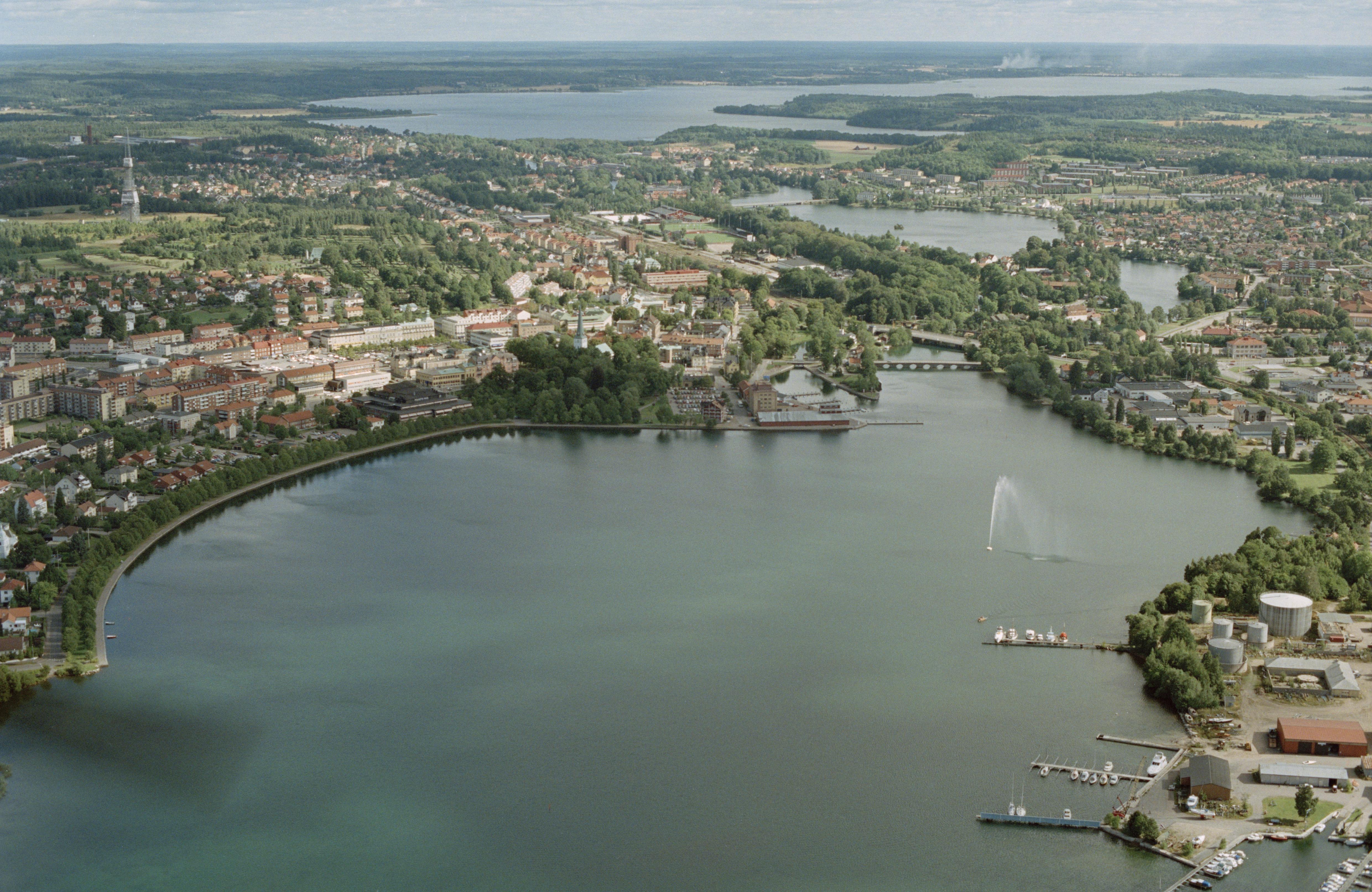 Beskrivning: Göta kanal och Motala ström vid Motala tätort och sjön Vättern. I bildens övre del tätorten Borenshult och sjön Boren. Vägmärke RAÄnr Motala 13:1 över bildens mitt. Bilden är tagen mot (väderstreck): ONO