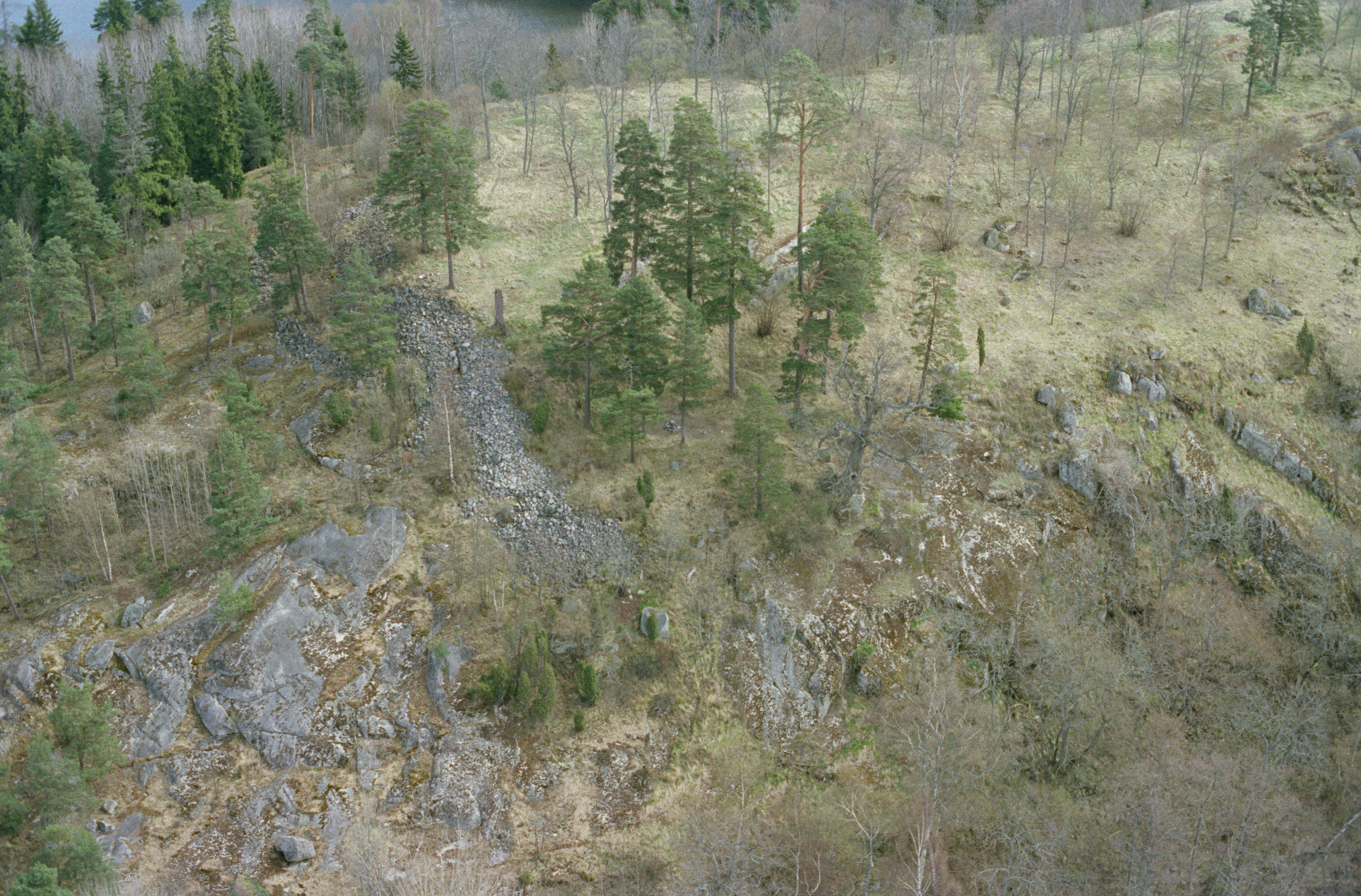 Beskrivning: Runsa fornborg / ?Runsa borg? RAÄnr Ed 2:1. Parti av mur. Bilden är tagen mot (väderstreck): V