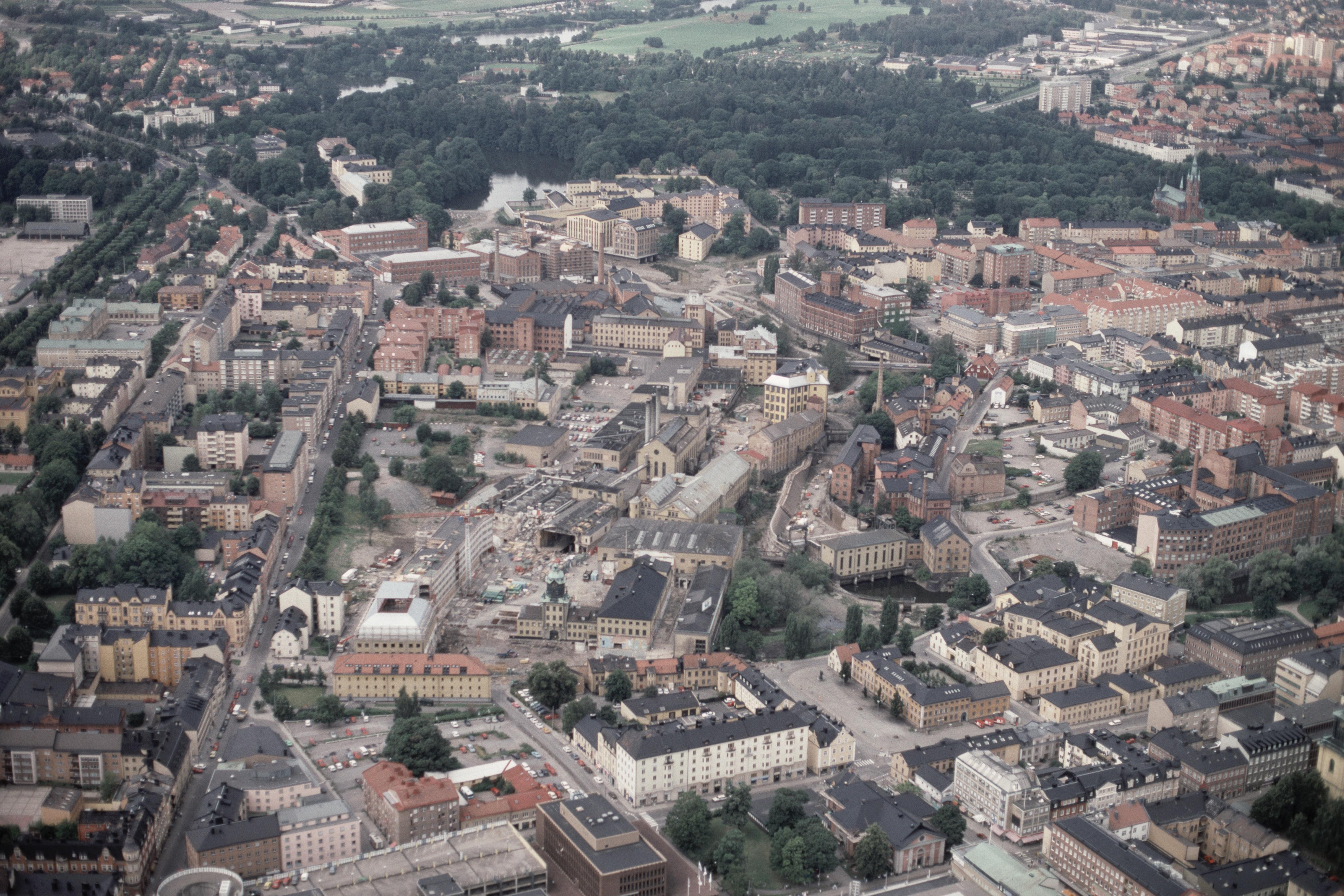 Beskrivning: Gamla staden i Norrköpings stad. Motala ström industristad (torrlagd). Sankt Olai kyrka nere till höger och Matteus kyrka uppe till höger vid bildens mitt. Bilden är tagen mot (väderstreck): V