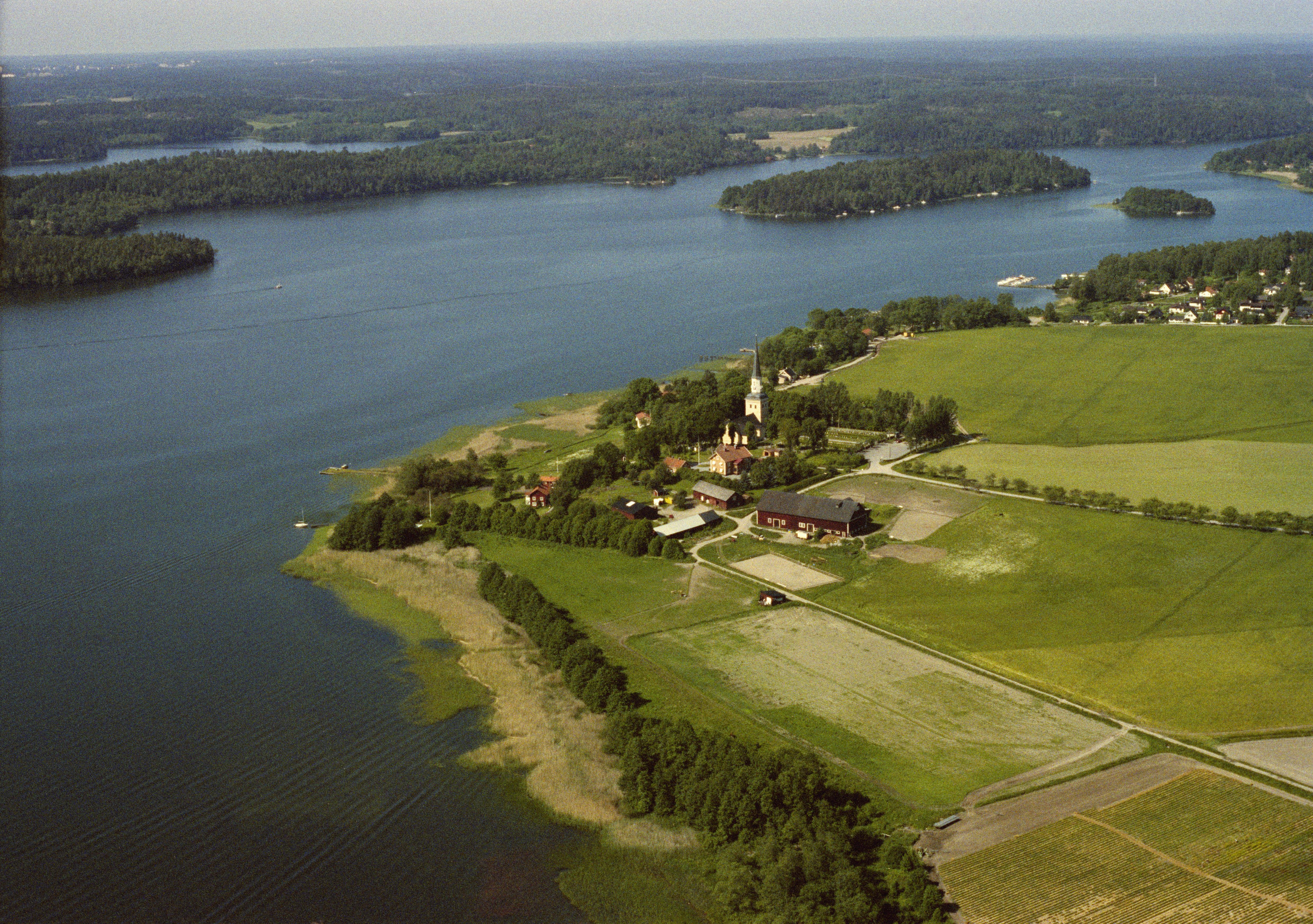 Beskrivning: Kyrkfjärden i Mälaren. Ekerö kyrka och Asknäs herrgård. Vid kyrkan flera fornlämningar, bl.a. hög RAÄnr Ekerö 2:1. Helgö uppe till höger. Bilden är tagen mot (väderstreck): VSV