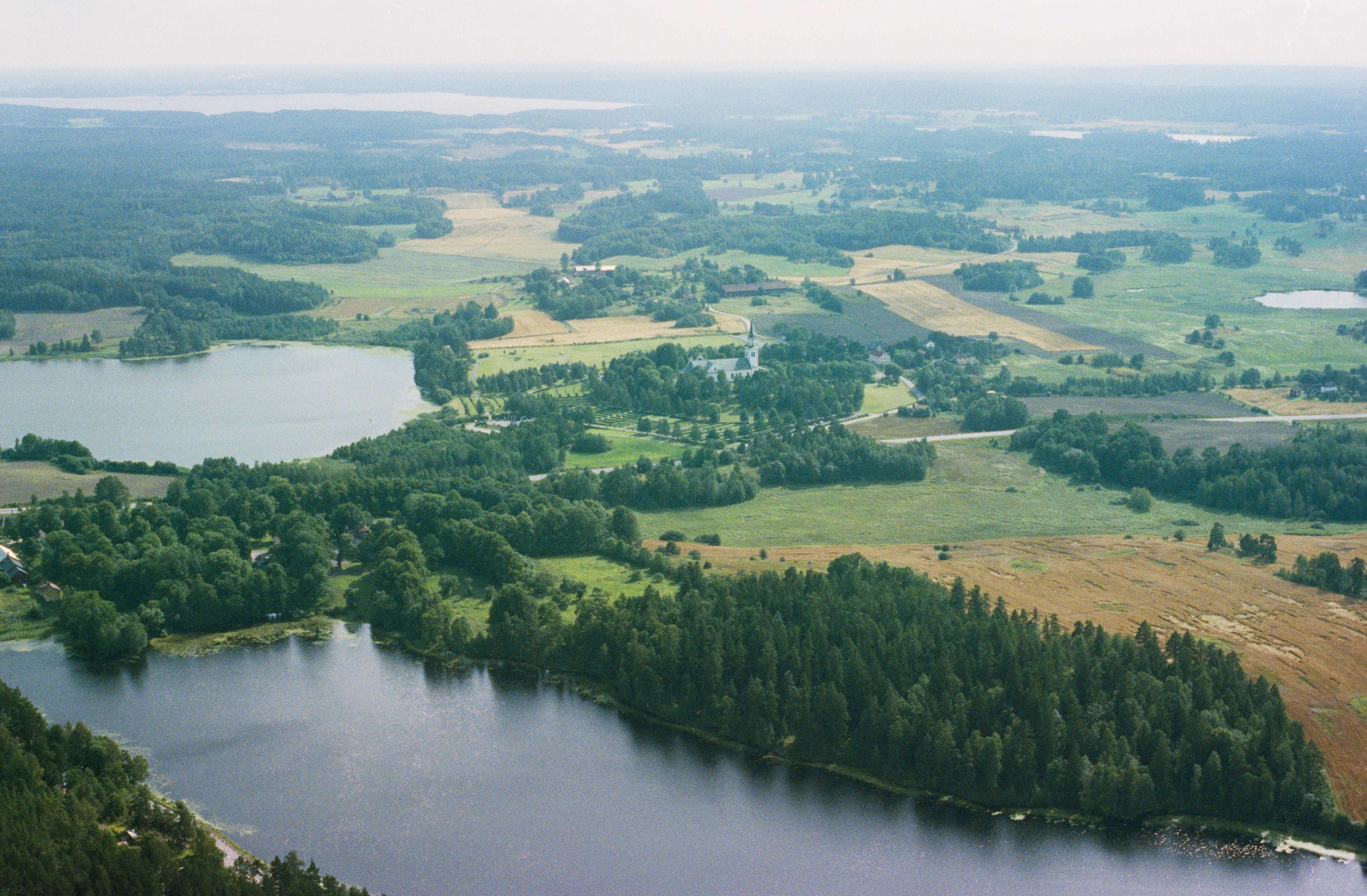 Beskrivning: I bildens nedre del sjön Gron. I bildens övre del Risinge nya kyrka vid Hultbisjön. Bilden är tagen mot (väderstreck): S