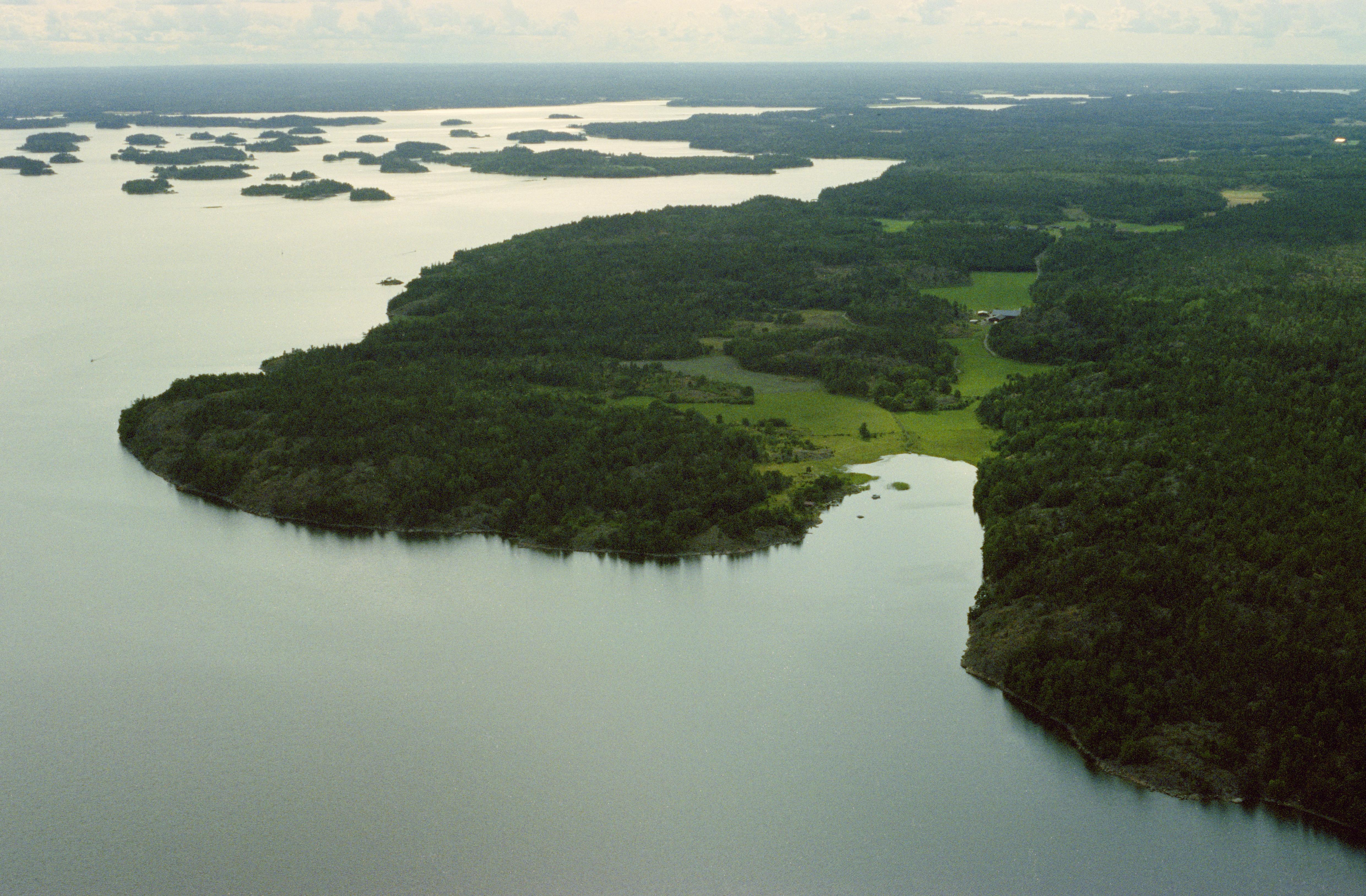 Beskrivning: Korpetorps by vid gränsen mot socknet Sankt Anna i Lönshuvudfjärden. Vårdkase RAÄnr Rönö 1:1 på udden Lönshuvud vid bildens mitt. Vid Korpetorp boplatser Rönö 8:1, 33:1, 34:1, 35:1 m.fl. Bilden är tagen mot (väderstreck): SV