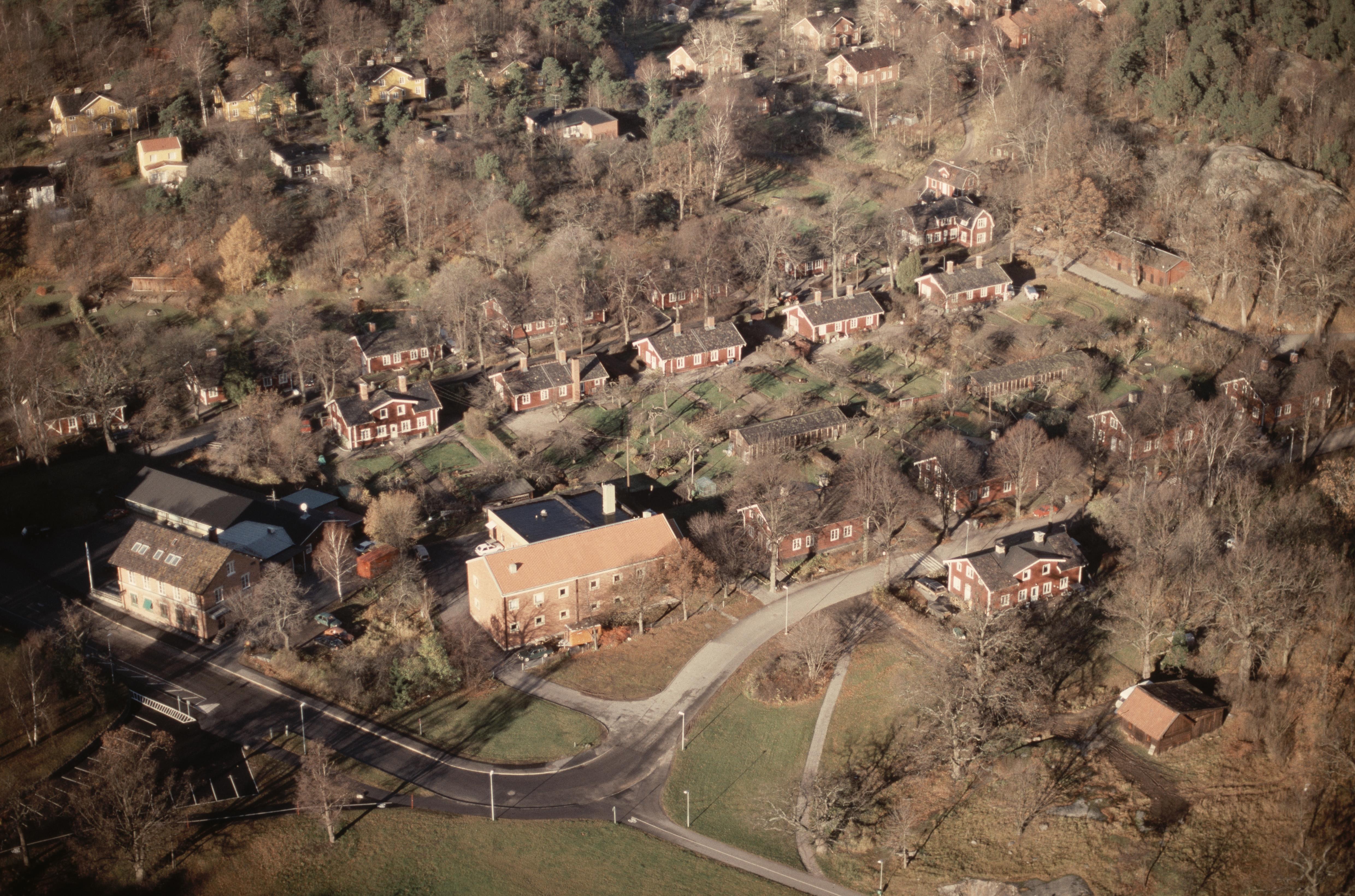 Beskrivning: Gustavsbergs tätort. Gustavsbergs kyrka. Över bildens mitt arbetarbostäder för porslinsfabriken, Grindstugatan RAÄnr Gustavsberg 36:1 med byggnaden det Gamla Apoteket i gatan övre ände uppe till höger. Värmdögatan till höger om bildens mitt. Bilden är tagen mot (väderstreck): NV