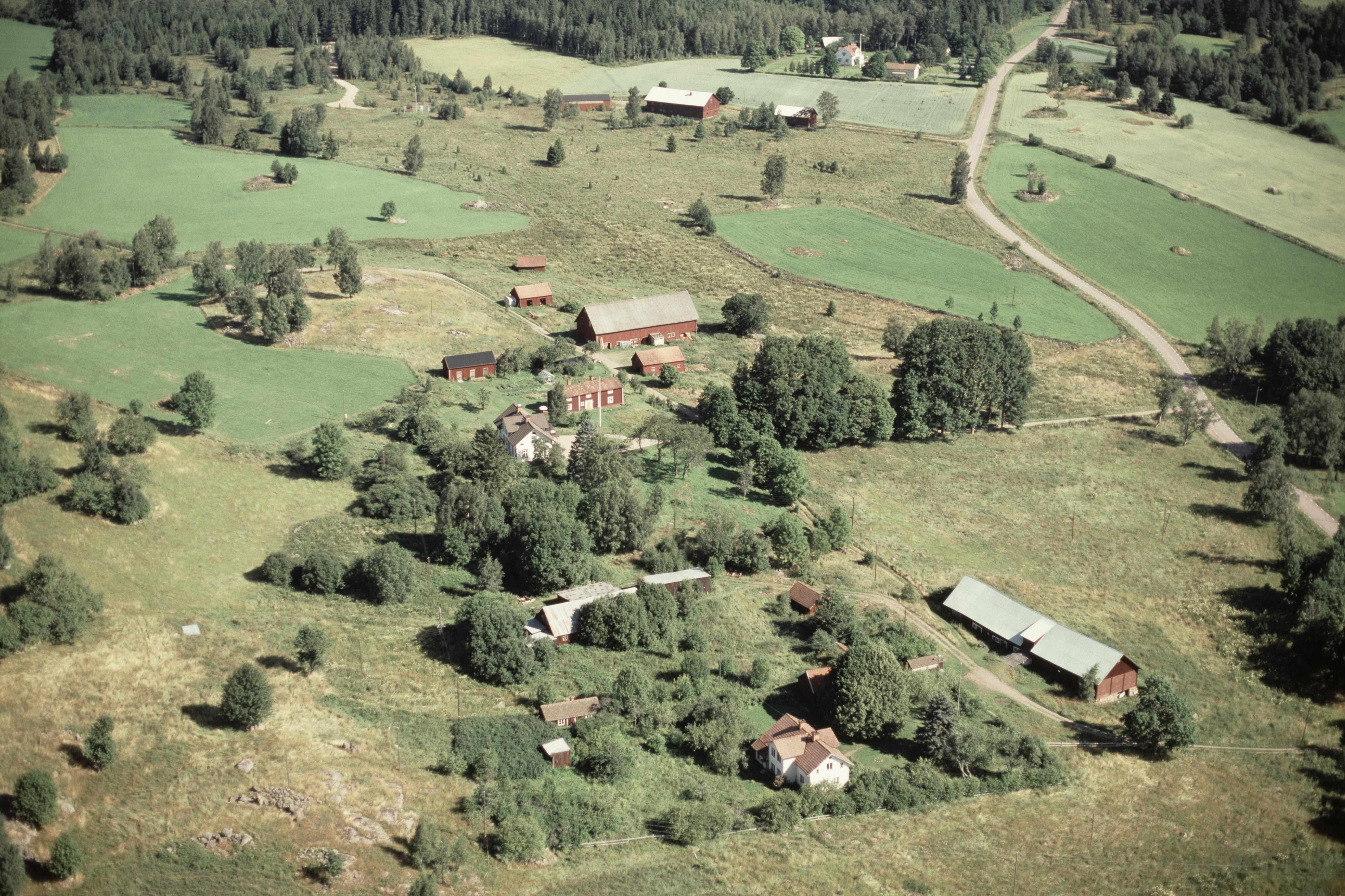 Beskrivning: Sörgården och Norrgården. Runristning RAÄnr Sund 12:1 till höger om bildens mitt. Bilden är tagen mot (väderstreck): N