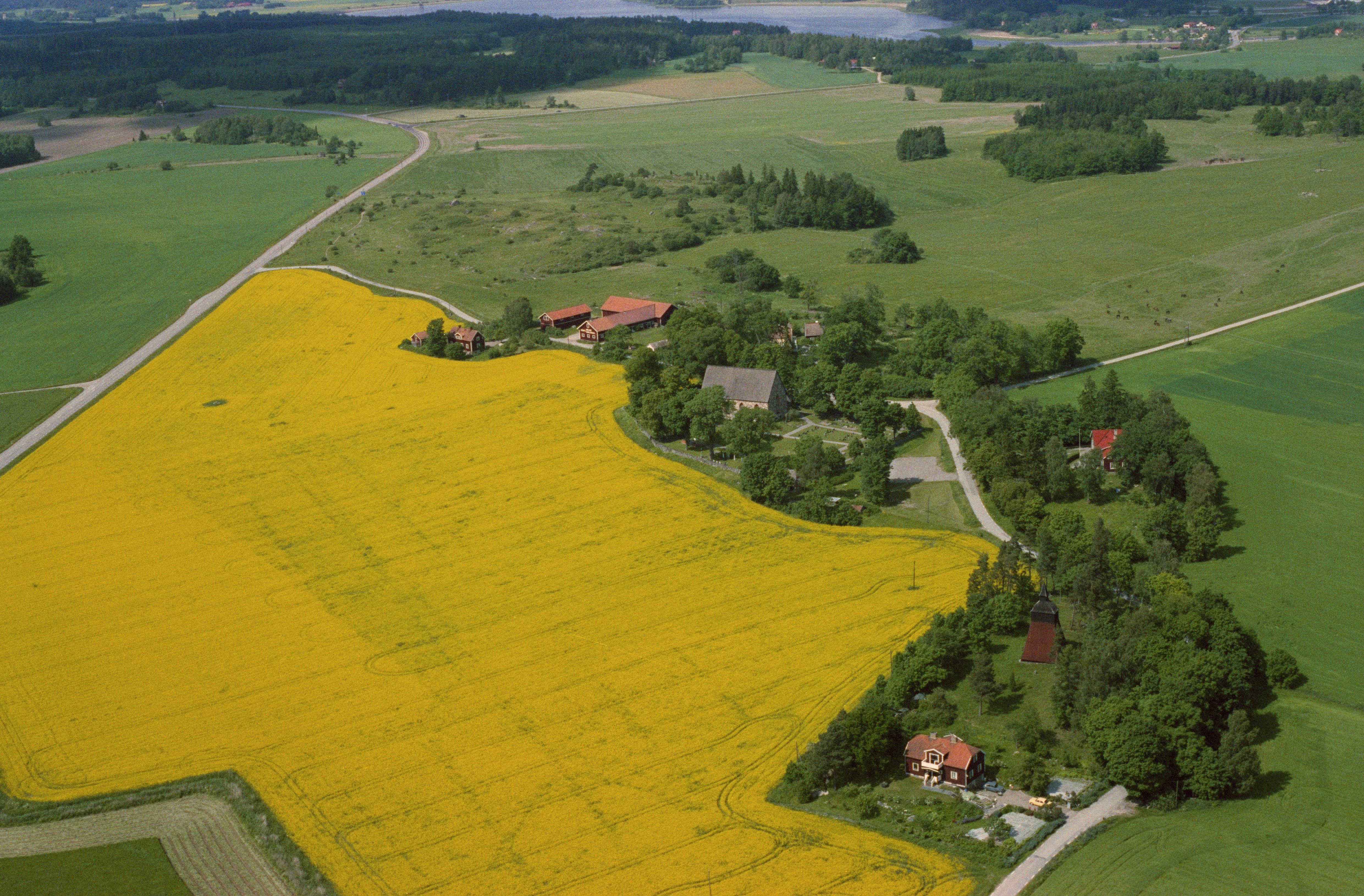 Beskrivning: Håtuna kyrka och kyrkby. Till höger om bildens mitt Prästgårdens gamla tomt RAÄnr Håtuna 157:1. I bildens övre kant Håtunaviken i Mälaren mot socknet Sankt Per. Bilden är tagen mot (väderstreck): NNV