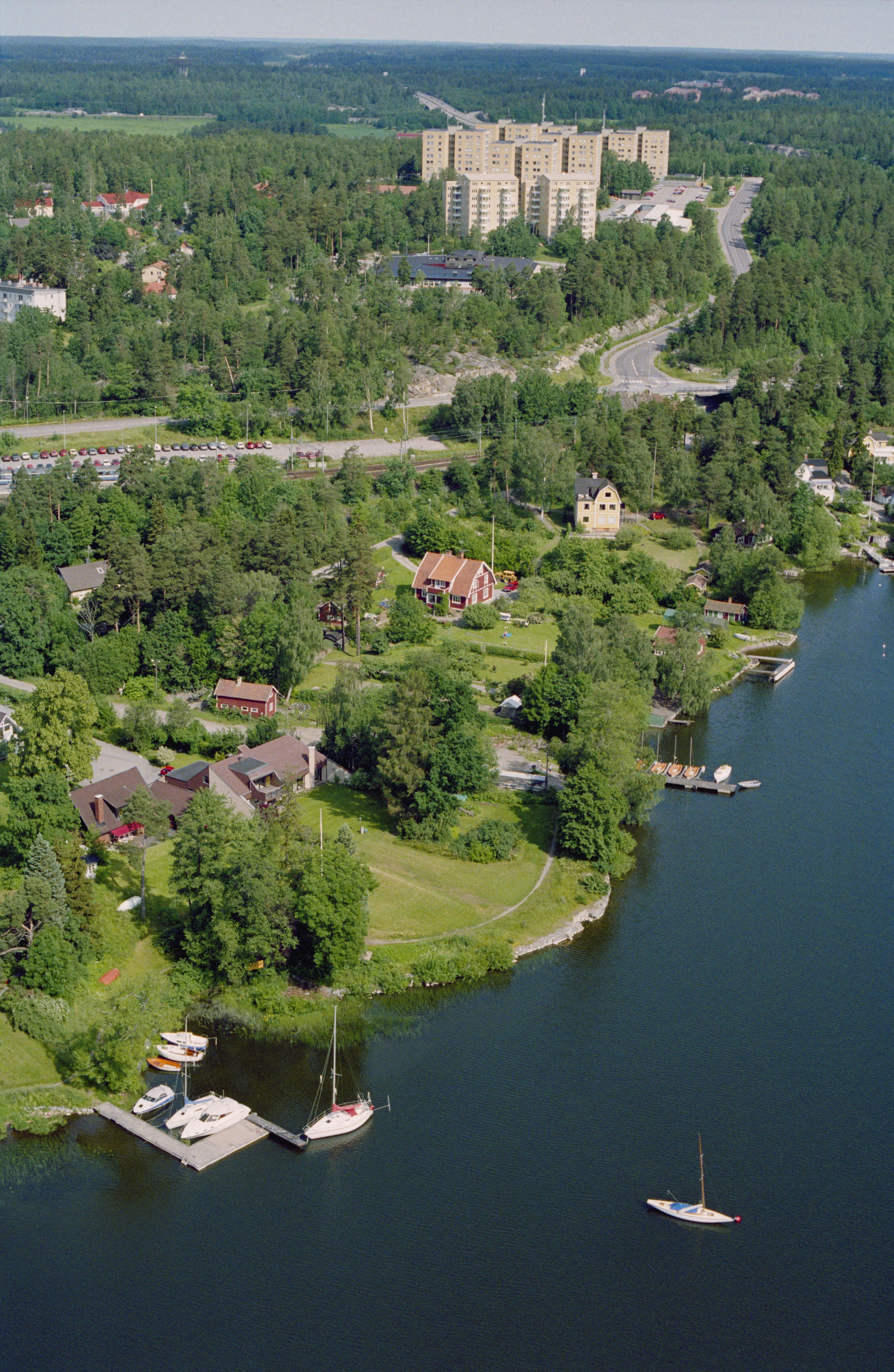 Beskrivning: Kungsängens tätort. Vid bildens mitt färdväg RAÄnr Kungsängen 138:1. I bildens nedre del Prästhagsvägen vid Görväln i Mälaren. Bilden är tagen mot (väderstreck): NNV