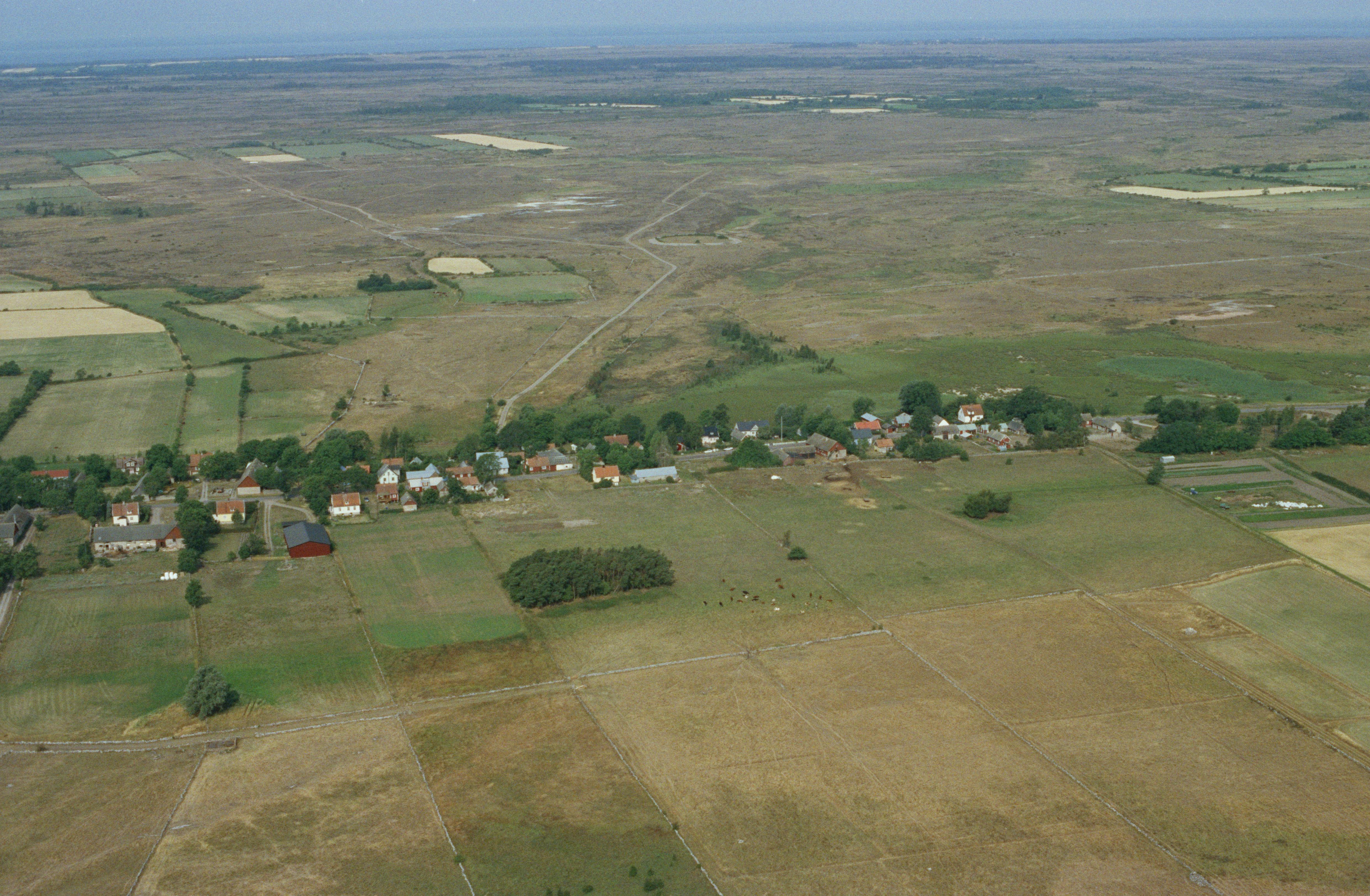 Beskrivning: Alvaret. Triberga by. I bildens övre del Triberga fornborg RAÄnr Hulterstad 20:1. Bilden är tagen mot (väderstreck): V