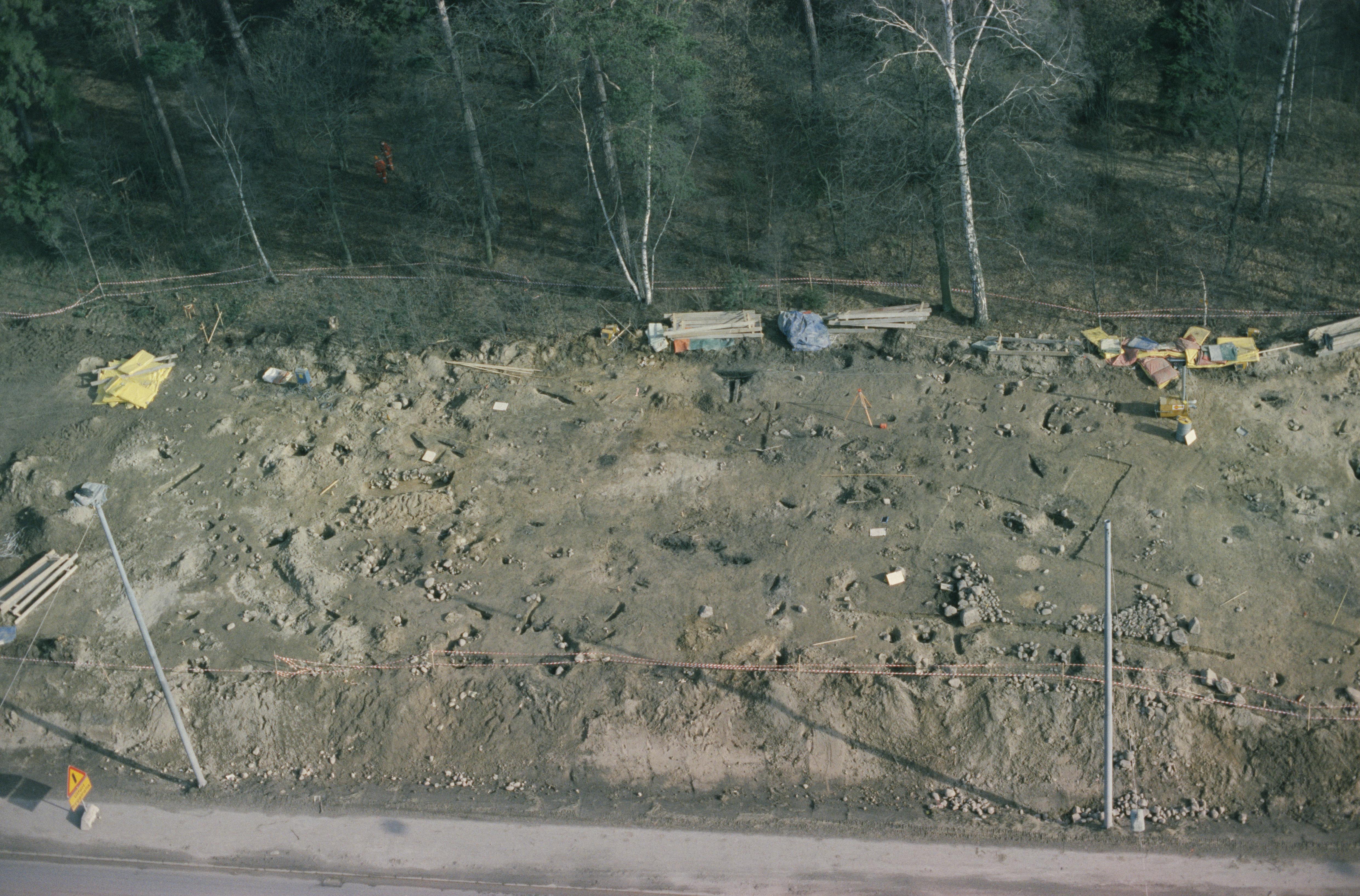 Beskrivning: Anmärkning (övrig): Riksintresse-nr/namn: AB37 - Solna. Socken: Solna. Motivering: A. Sockencentrum för den stora Solna socken, som ursprungligen innefattade hela nuvarande Stockholms innerstad, framför allt präglat av 1100-talets rundkyrka med senare tillbyggnader och tillhörande bebyggelse från främst 1700-talet. - B. Haga - Ulriksdals kungliga slottsmiljöer med lustslott och stora parkanläggningar med nära vattenkontakt, som i sin utveckling framför allt speglar stormaktstiden, den gustavianska epoken och 1800-talets första hälft. Miljöerna har ett nära samband med ett större område dominerat av kungarna och staten. - C. Norra begravningsplatsen, invigd 1827, som i planering och anläggningar visar begravnin(…) Texten i detta fält har förkortats vid migrering till e-arkivet. Se filbilagan extra.xml för fullständig information under note_archivist. Beskrivning: Arkeologisk undersökning vid väg E4 mellan Norra begravningsplatsen och Hagaparken. Boplats RAÄnr Solna 85:1. Bilden är tagen mot (väderstreck): ONO Fotosyfte: Flygbildsdokumentation