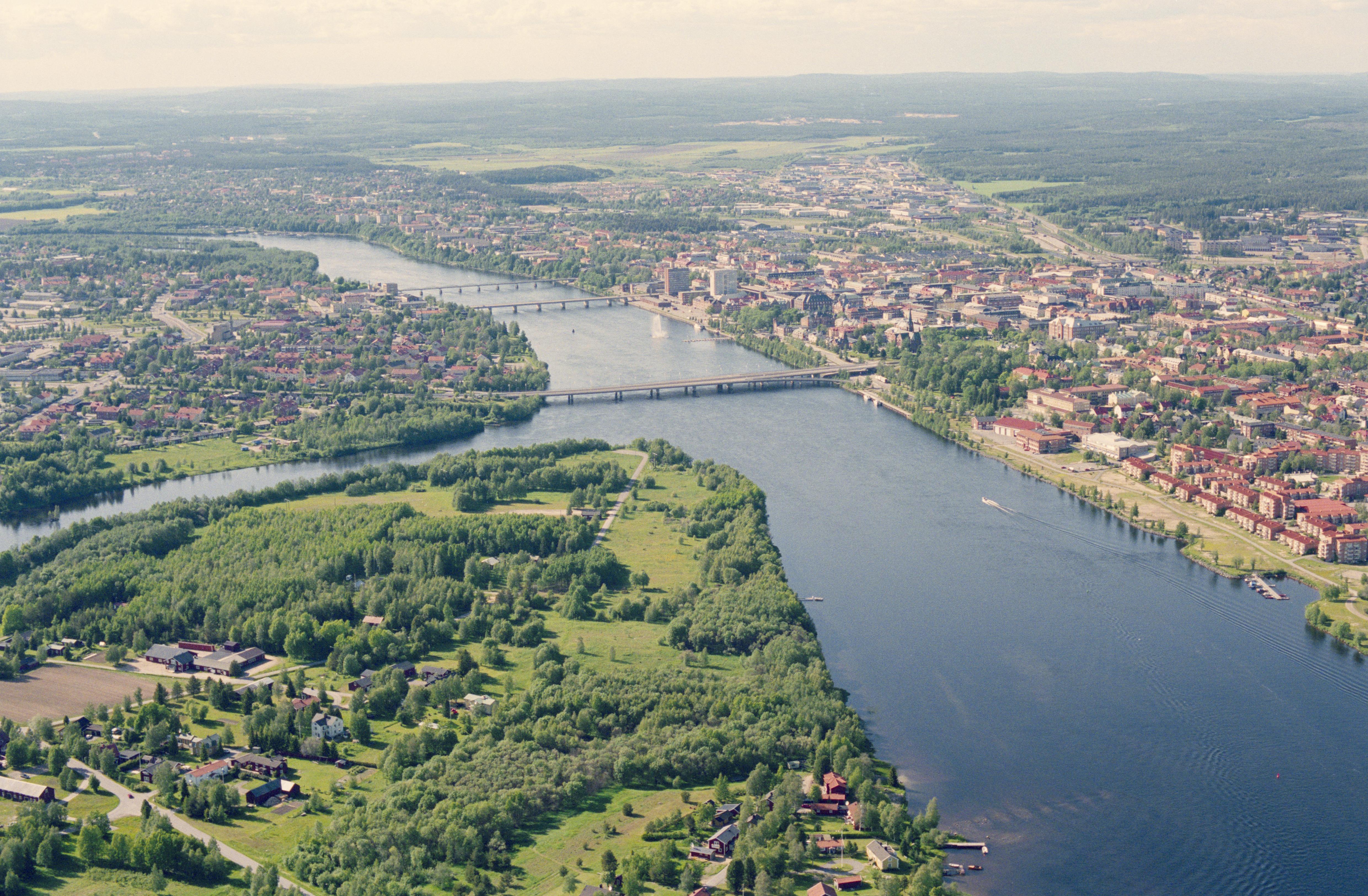 Beskrivning: Umeälven i Umeå stad. Ön i bildens nedre del. Kyrkbron vid bildens mitt. Till höger om bron Umeå Stads kyrka i Umeå stads centrum / stadslager RAÄnr Umeå stad 128:1. Bilden är tagen mot (väderstreck): NV
