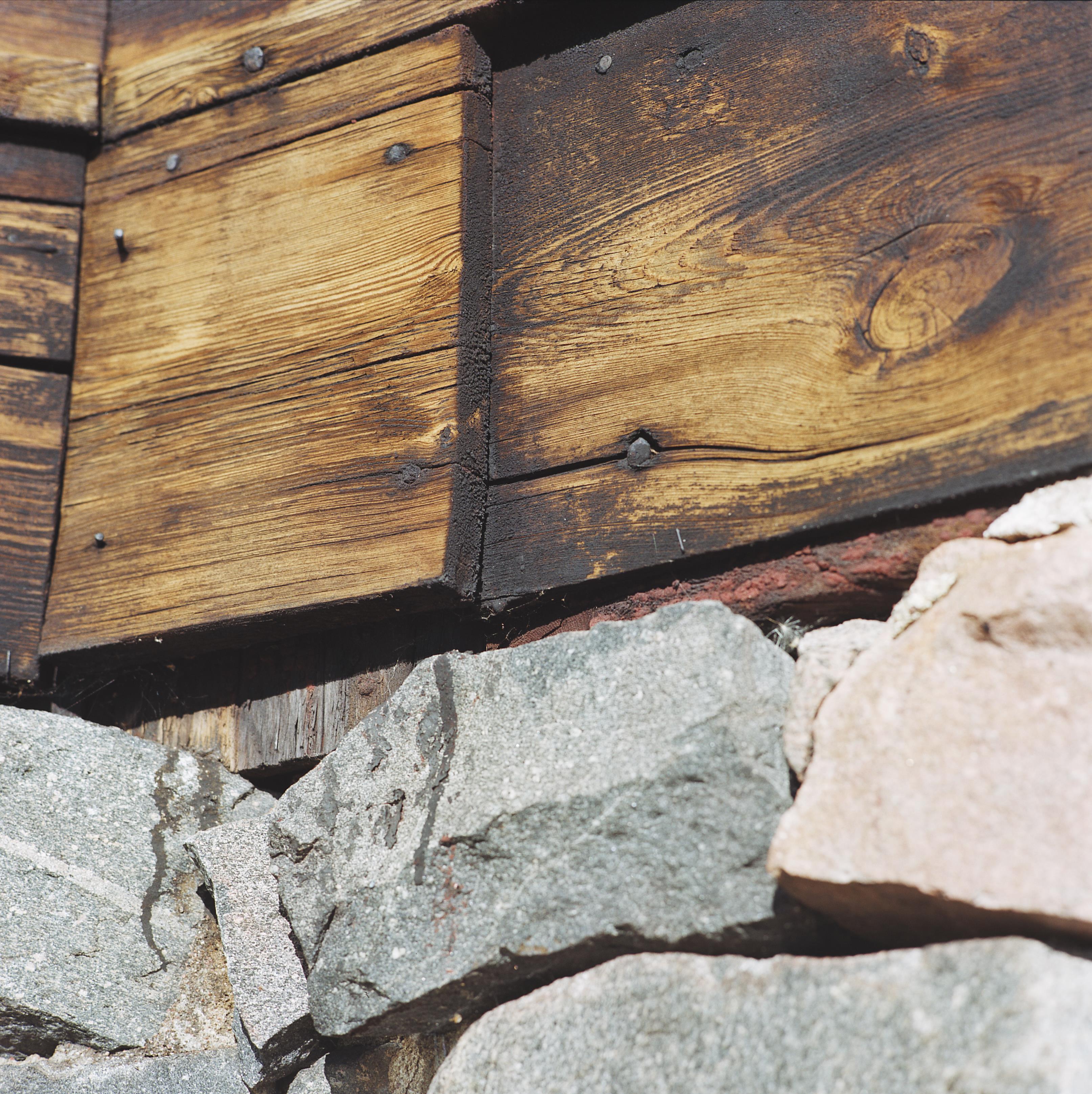 Beskrivning: Sydöstra hörnet detalj av syllbrädan med syllstock och äldre knutbräda synlig. Spår av äldre färg?