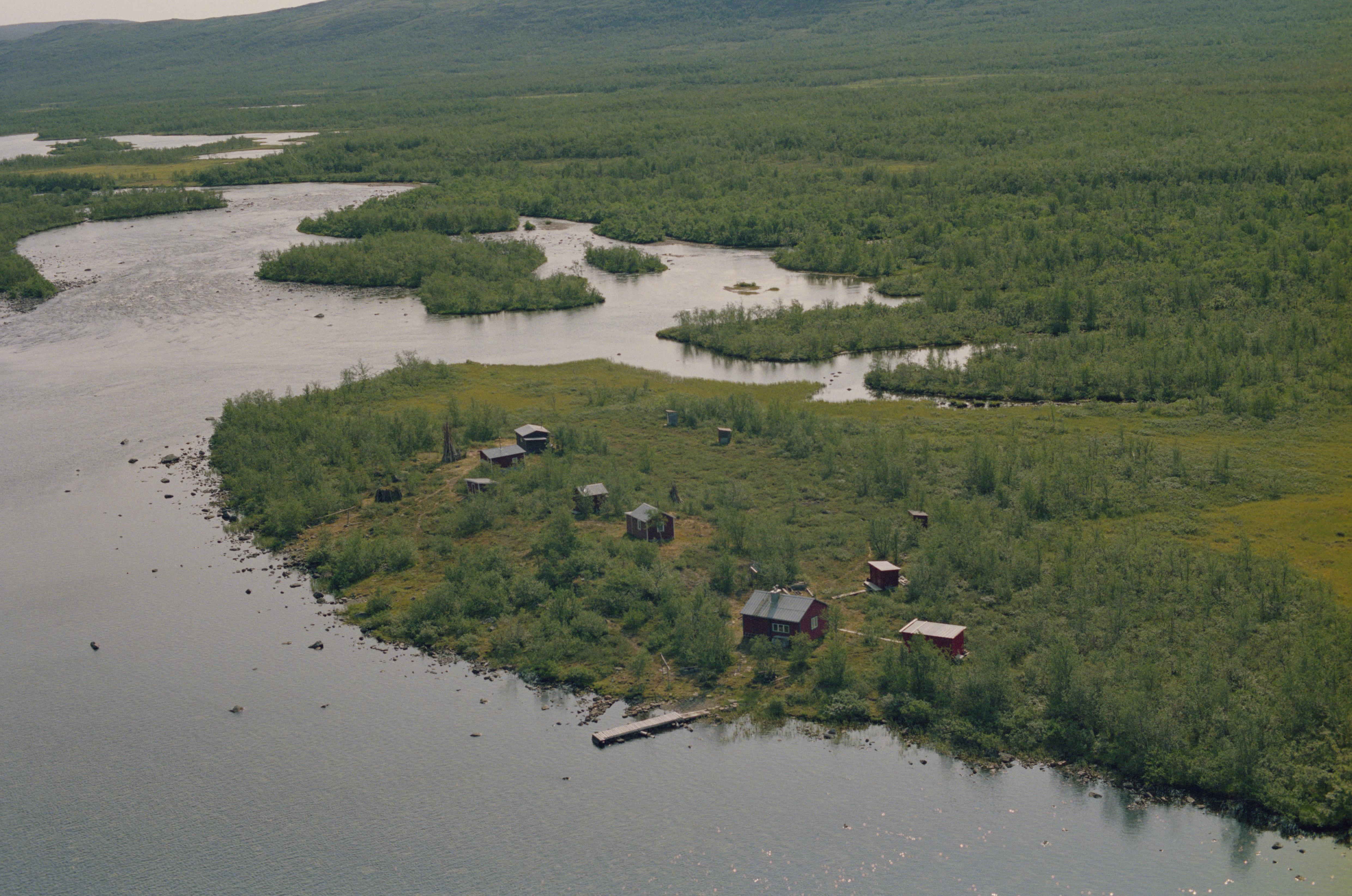 Beskrivning: Sjön Rautasjaure (Rávttasjávri), sydöstra ändan vid området Rautasluspen (Rávttasluspi). Under bildens mitt ett sameviste. I bildens övre del deltaområdet där åarna Rávttaseatnu och Guolbanjohka möts. Bilden är tagen mot (väderstreck): SSO