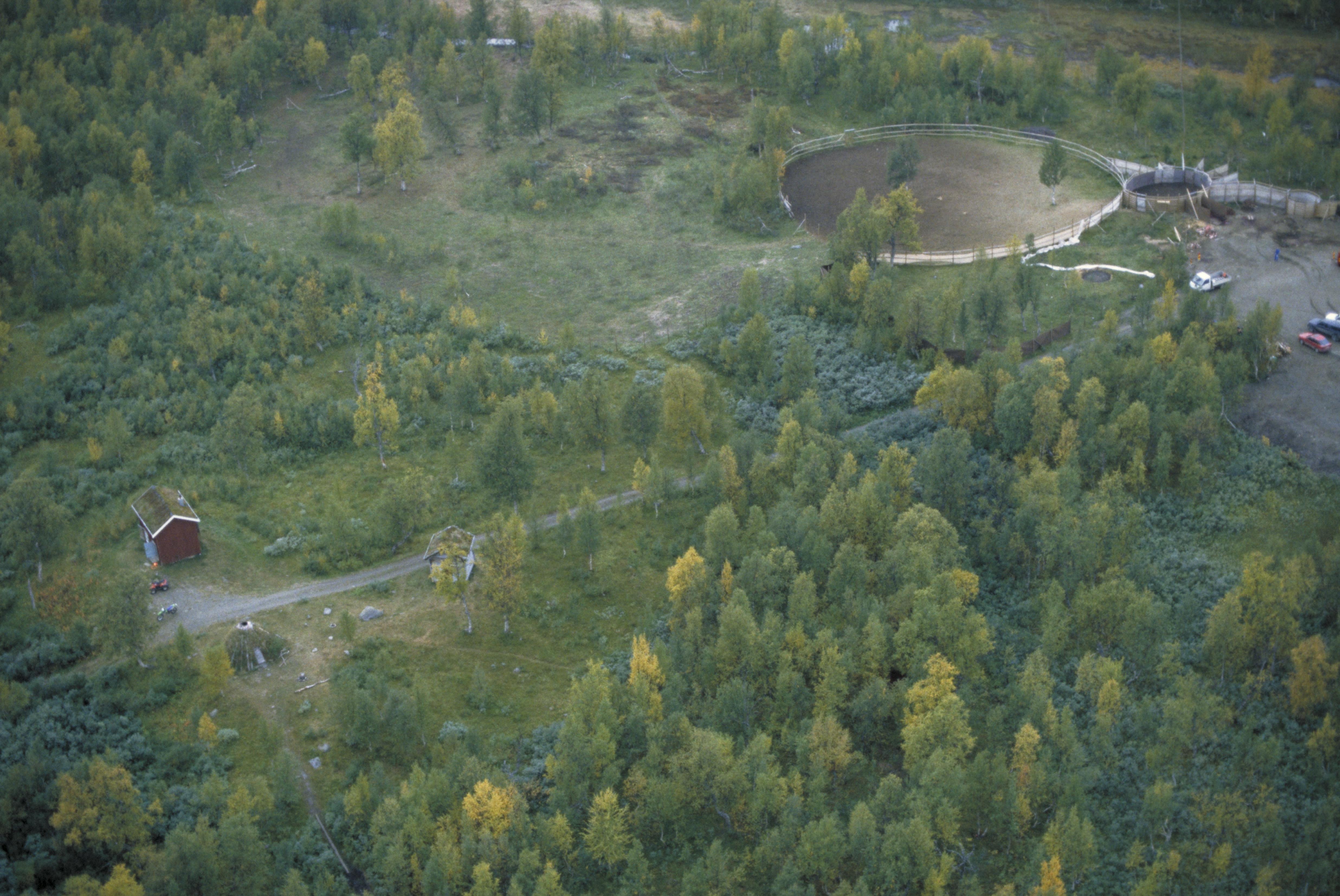 Beskrivning: Samisk kulturmiljö på och vid fjället Atoklimpen (Aatoeklibpie / Atoklinten), väster om Atofjället. Till vänster i bildens nedre del Atostugan (RAÄnr Tärna 665:1) - en timmerstuga inom området för samebyn Vapsten. Ett rengärde till höger i bildens övre del. Området Atoklimpen är kulturreservat sen 2005. Bilden är tagen mot (väderstreck): NNV