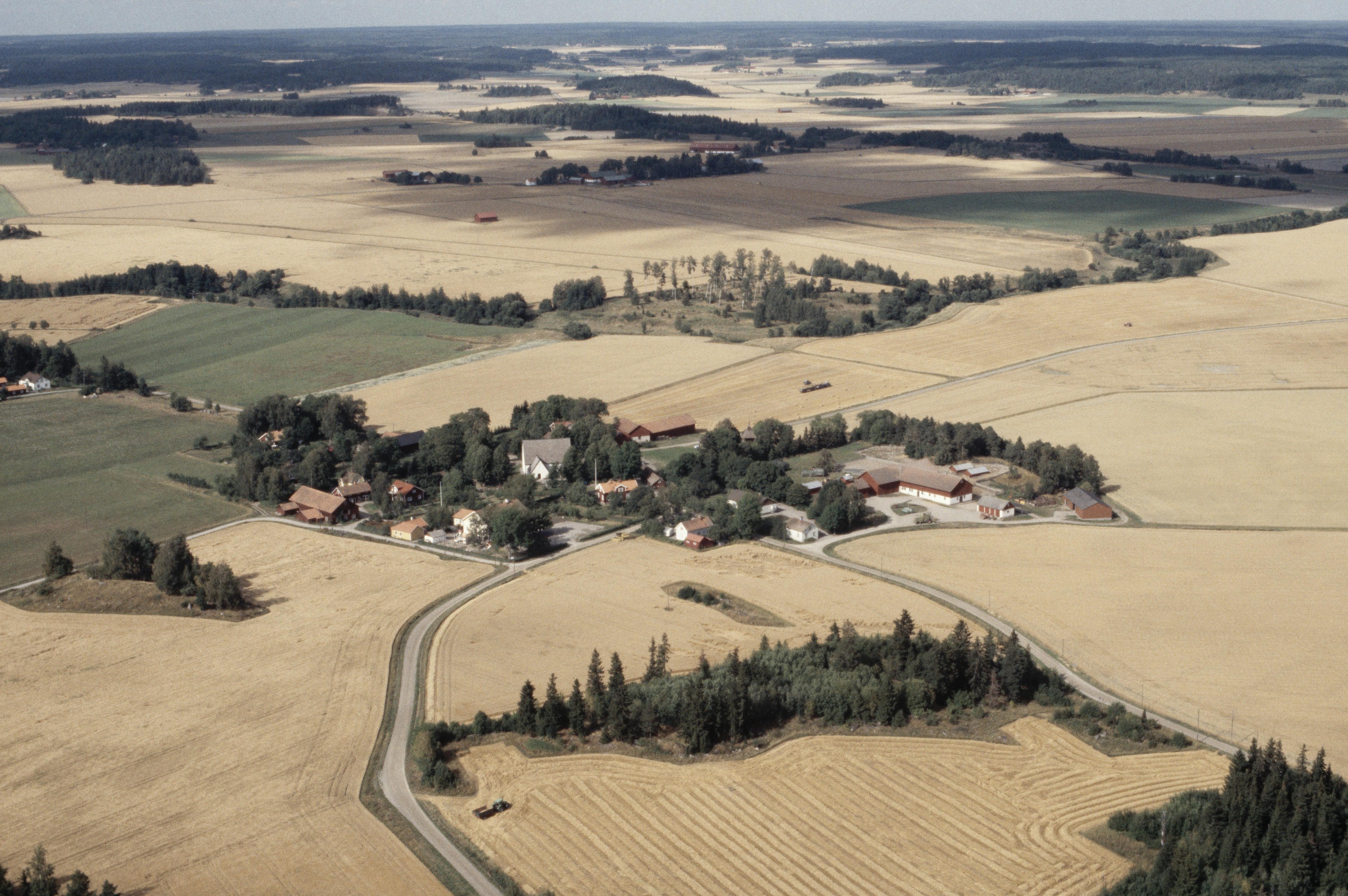 Beskrivning: Härnevi kyrka och kyrkby. I bildens övre del Örsundaån som markerar gränsen mot Torstuna socken. Bilden är tagen mot (väderstreck): NNO