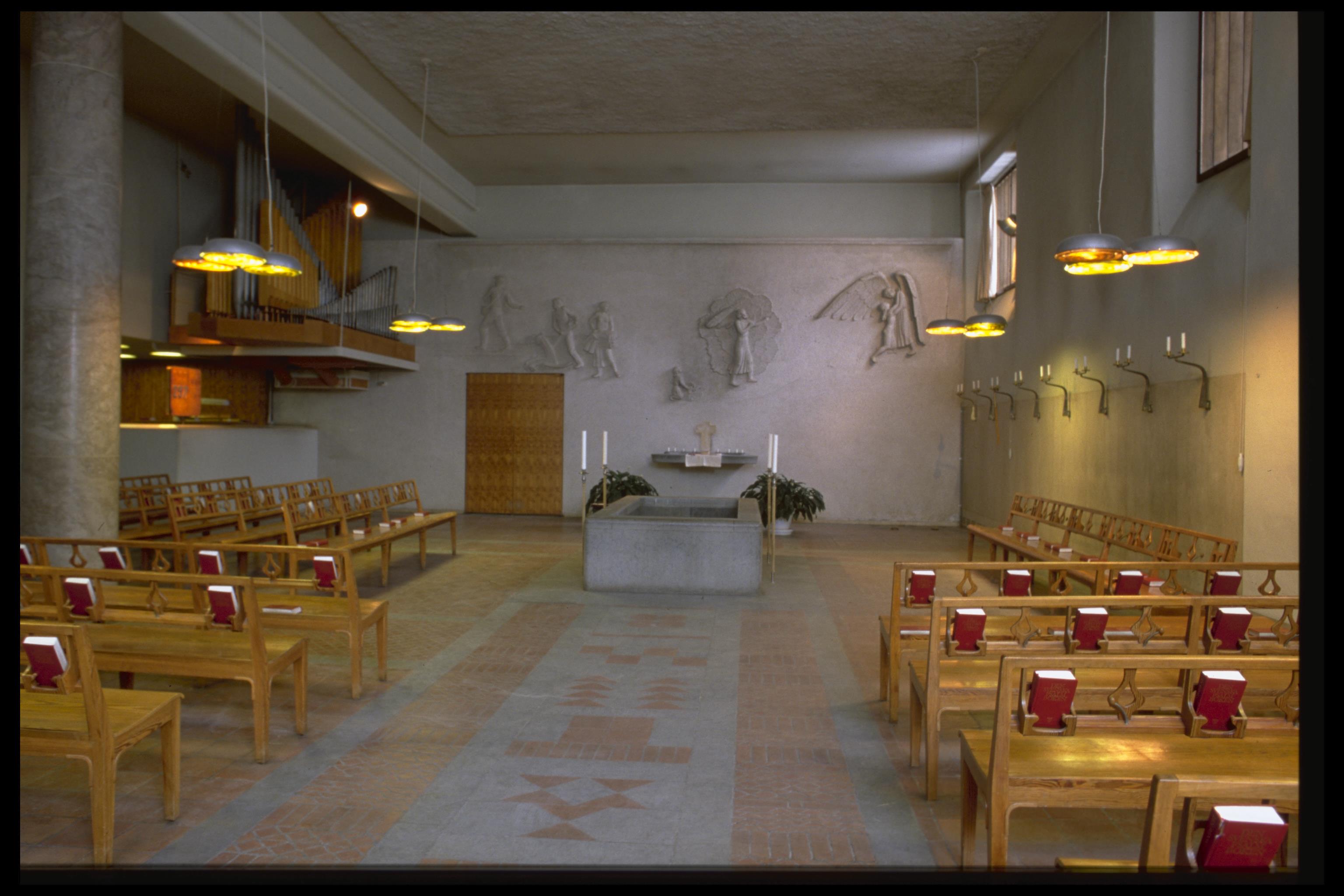 Beskrivning: Trons kapell. Interiör med altaret och katafalken.