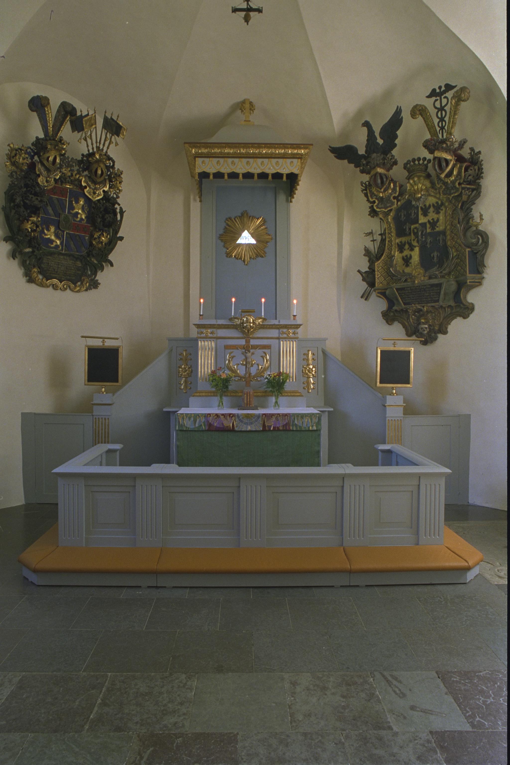 Beskrivning: Altaret med bakomliggande predikstol.